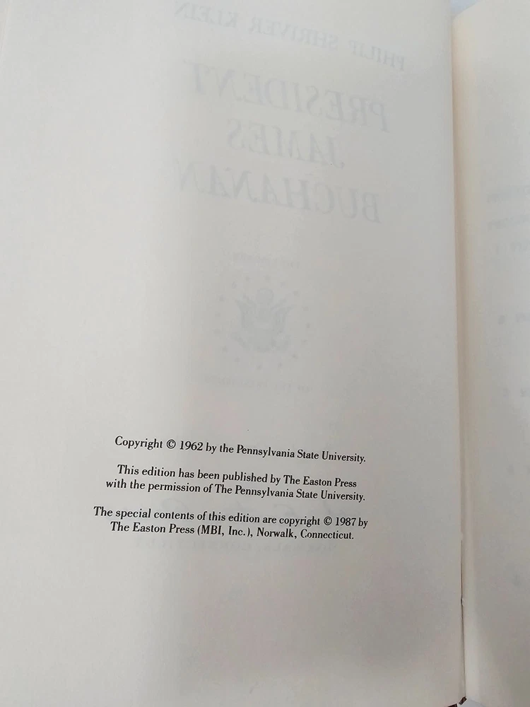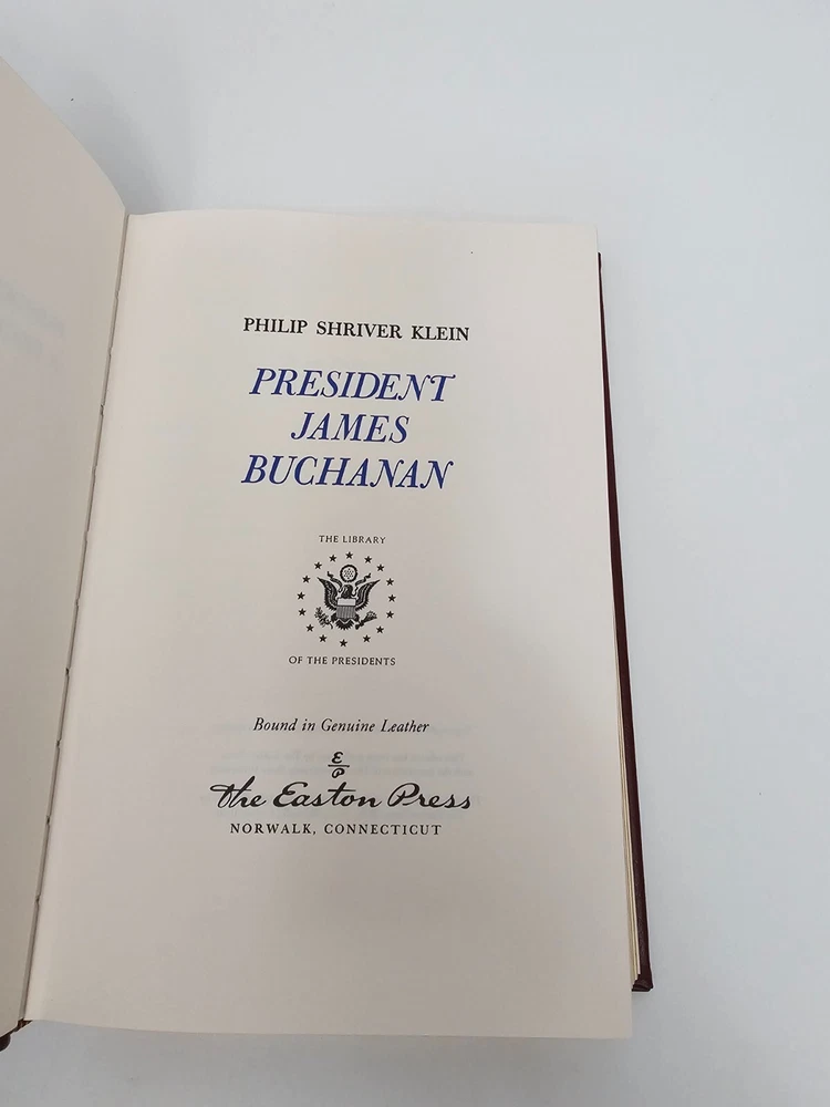EASTON PRESS PRESIDENT JAMES BUCHANAN WITH COLLECTOR'S NOTES By PHILIP SHRIVER KLEIN * The Library of the Presidents * Easton Press 1987 This book is leather bound with gold lettering and gold page edges . It is in very good condition. There is a scrape on the top of the page edges (see photo). Please use enlargement feature in order to see closely. We offer combined shipping in order to save $$$. Please be sure to ask any questions BEFORE purchasing! Thank you! We appreciate our buyers and want to do our best to make this a positive eBay experience for you. If there is an issue upon receipt of your purchase please send a message through eBay before opening a return. It is important to us to make it right. Our goal is to satisfy you! See my other listings for more great items! We ask for payment within 3 days. Shipping quoted is for lower 48 states only. We ship through FedEx, UPS and USPS, depending on which is least expensive. We ship ONLY through ebay's global shipping program for international shipments and we do not ship to APO boxes. Also, we do not guarantee the estimated shipping arrival provided by ebay because once the item is placed with the carrier, it is out of our control. txzj pxzj7585 txzj-11 txzj111 txzj115