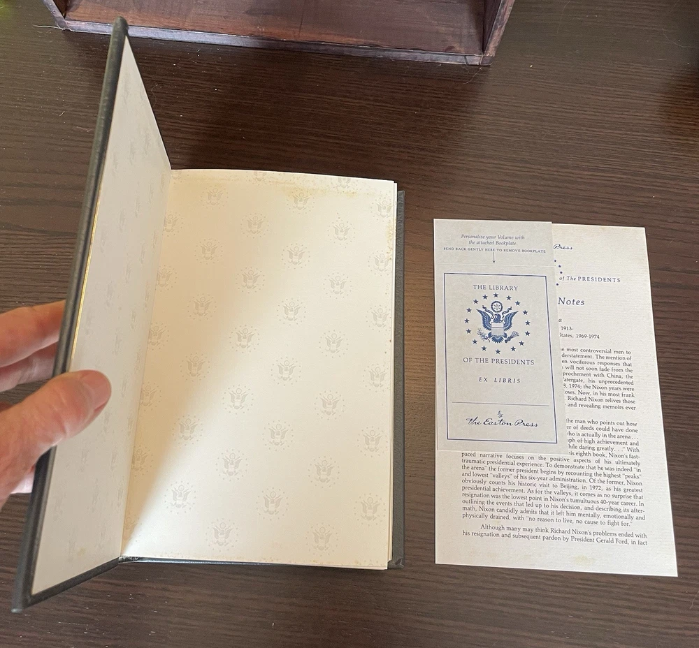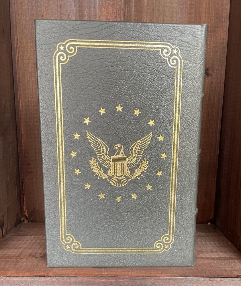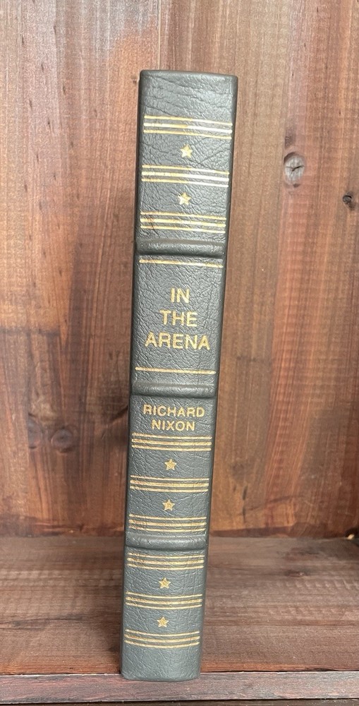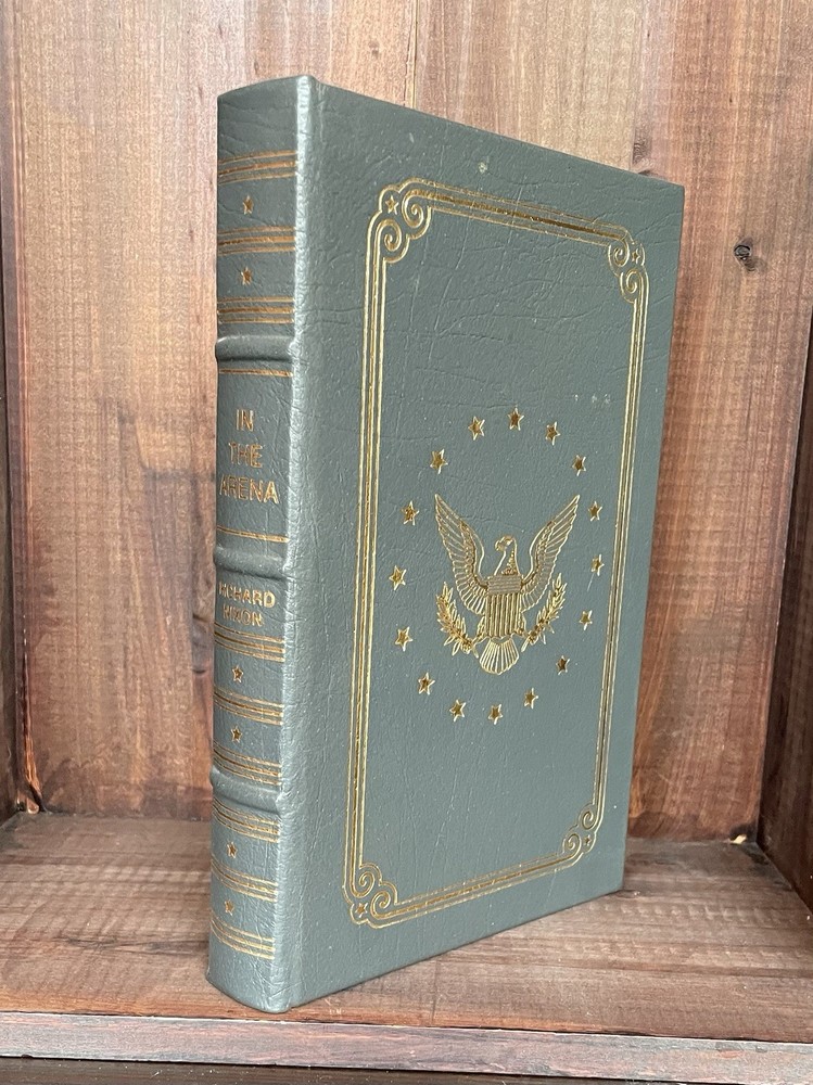 Offering this handsome deluxe leather fine binding edition of In the Arena: A Memoir of Victory, Defeat and Renewal by Richard Nixon. Easton Press, 1990. Collector's Edition, The Library of the Presidents. Full leather hardcover decorated with 22k gold, and gold page edges, and attached ribbon page marker. Collector's Notes and blank Easton Press book plate included. Light foxing to page edges. Else clean and unmarked with light wear. Nice copy!