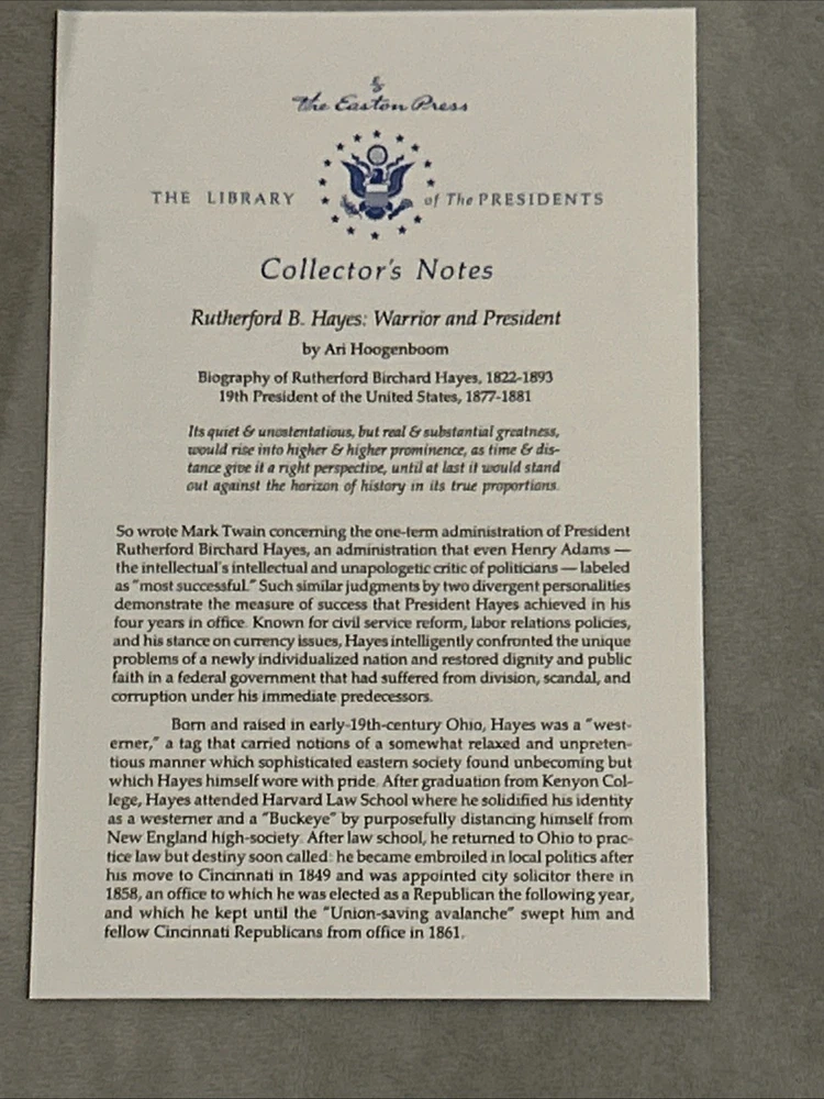 Delve into the political landscape of a bygone era with "Rutherford B. Hayes: Library of the Presidents" by Ari Hoogenbloom. This Easton Press edition boasts a luxurious leather binding that exudes a classic feel, making it a fine addition to any collection. The book offers an in-depth look at the life and presidency of a notable political figure, encapsulating both biography and autobiography within its pages. Ari Hoogenbloom's work is a tribute to the 19th president, presenting a mix of historical facts and personal anecdotes. Published by Easton Press, known for their high-quality releases, this book is a must-have for enthusiasts of political history and collectors alike. Whether for reading or display, this volume is sure to be a conversation starter.