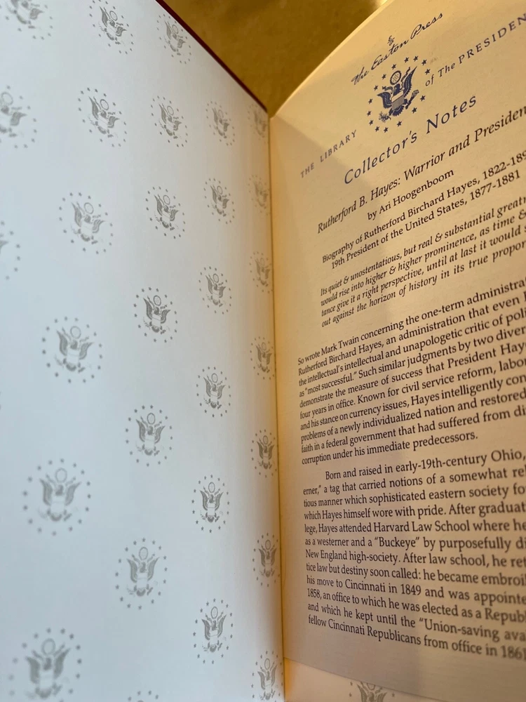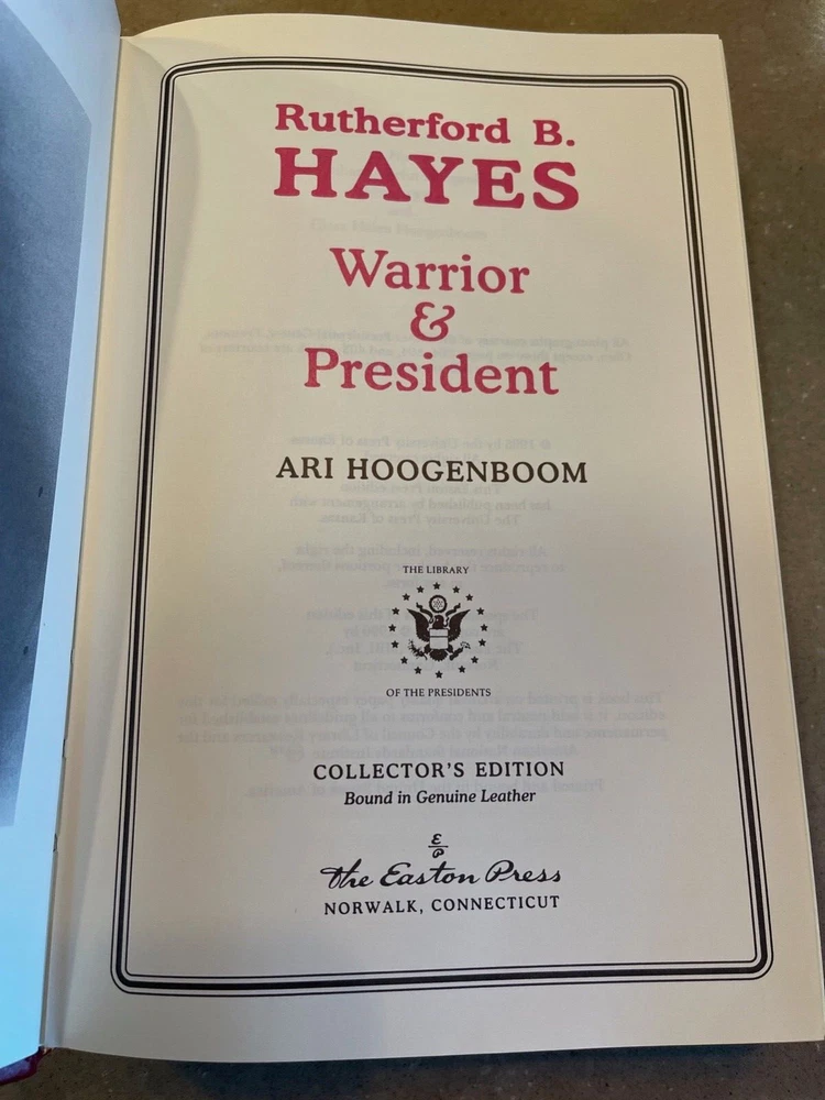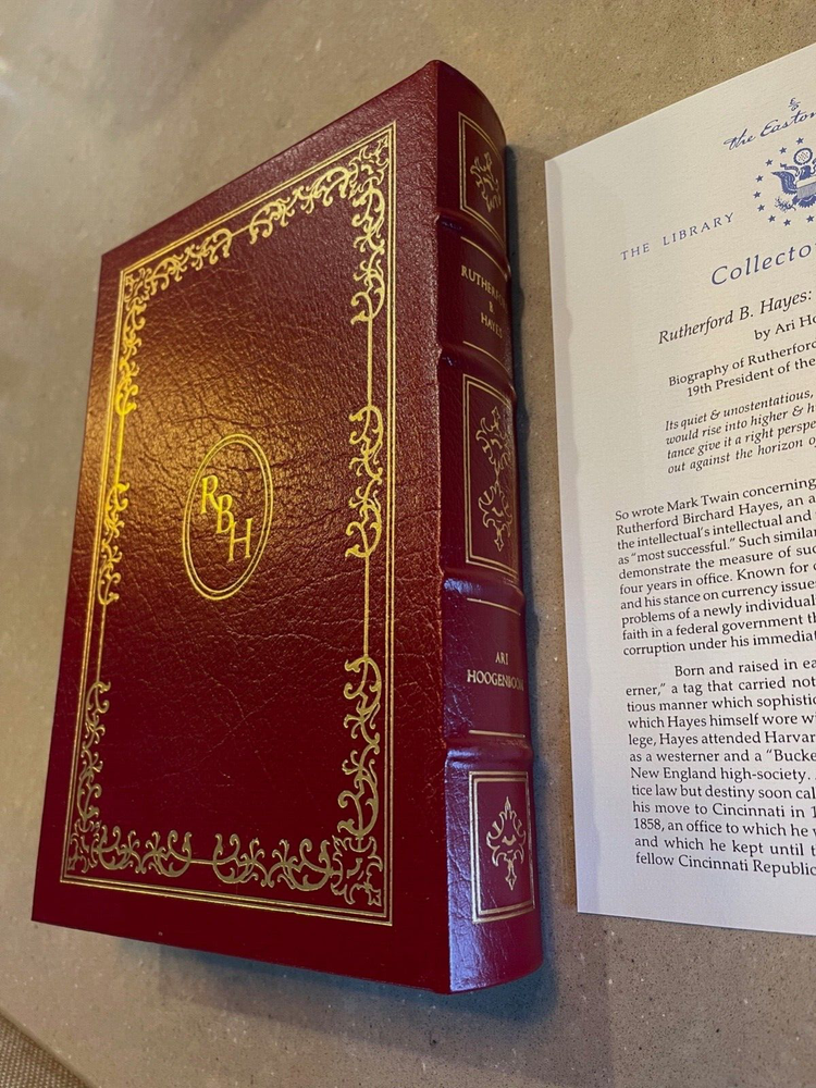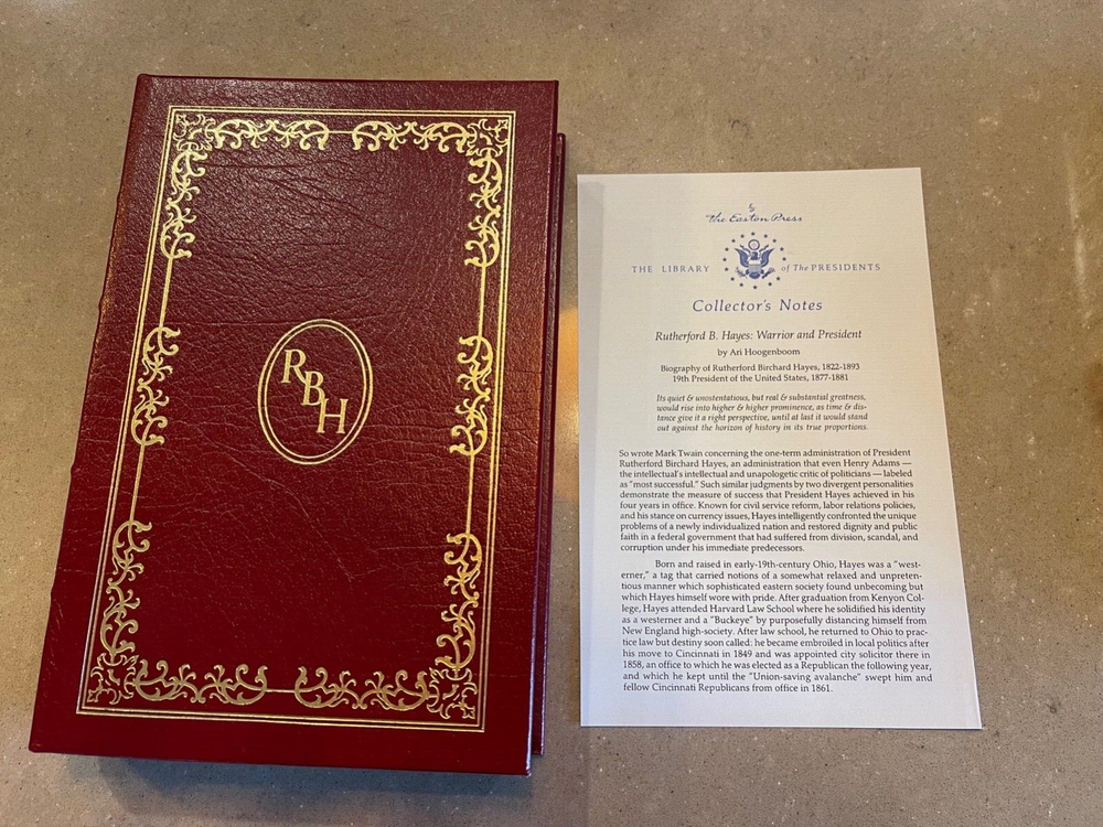 Easton Press: Rutherford B. Hayes: Warrior and President, Ari Hoogenbloom, with Collector's Notes This book is part of the Easton Press Presidential Library Collection. The book has never been read and is in excellent condition with no markings, name plates, highlights, tears or dog-eared pages. The leather cover is in great condition with only minor shelf wear on edges. The gold gilding is bright, though there are a few light rubs/marks on the side edge. The ribbon and binding are intact. Please see photos. I am the original owner; comes from a smoke-free home.