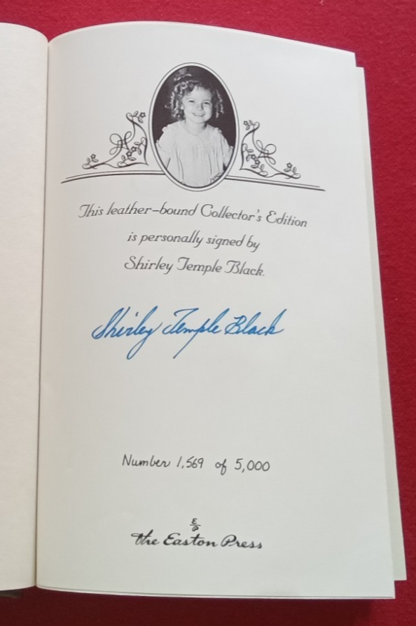 Child Star by Shirley Temple Black. SIGNED by Shirley Temple Black using blue ink on the copy number page. This book is NUMBERED 1,569 of 5,000. Leather bound hardcover without dust jacket. Illustrated. Gold gilt intricate surface designs on the front, rear and spine surfaces. The external page edges on three sides are gold gilt. Placemarker ribbon is attached and seems never to have been used. Spine surface has four raised ribs. SIGNED COLLECTOR'S EDITION (stated). Bound in Genuine Leather (stated). Copyright 1988 (stated). The special contents of this edition copyright 1996 (stated). Published by Easton Press. Book is in LIKE NEW condition.