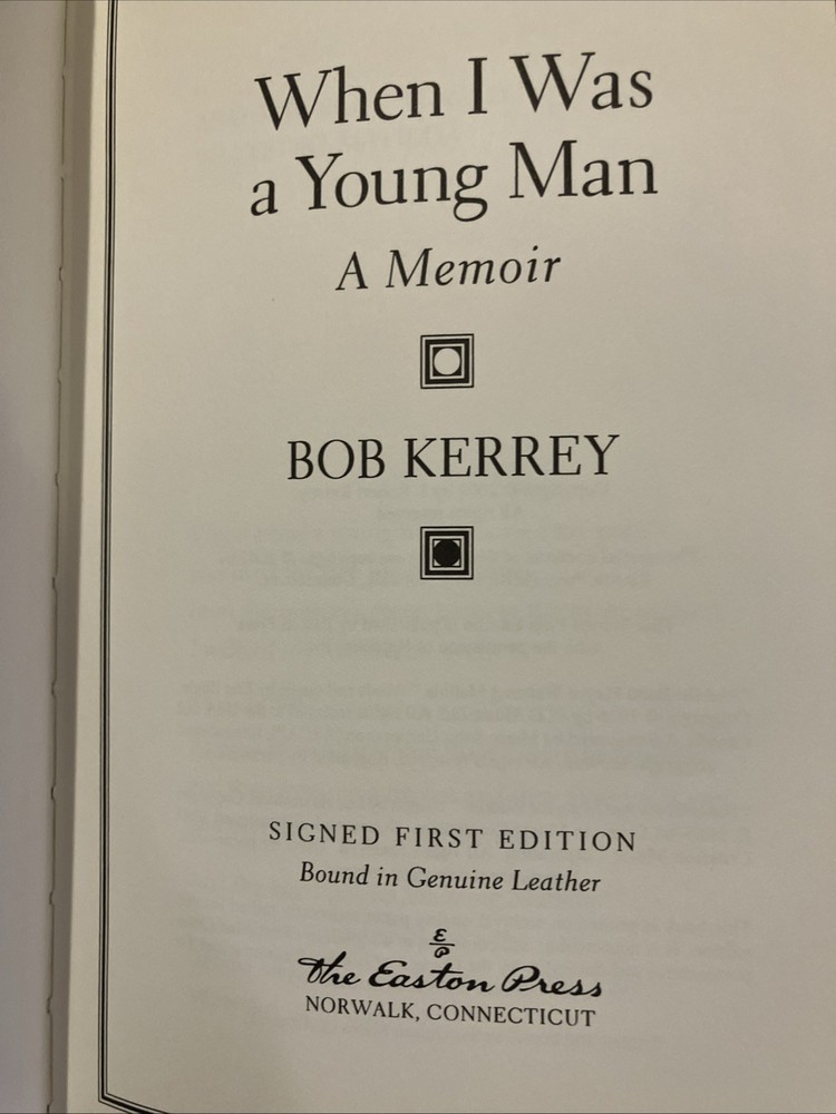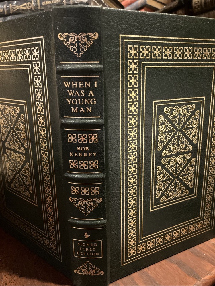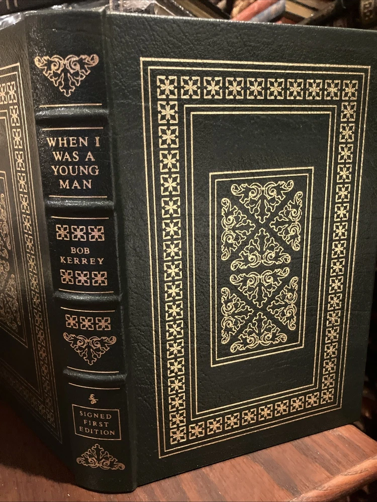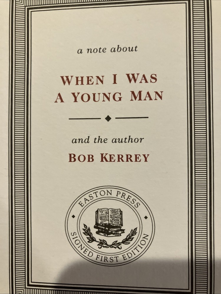 Easton Press leather edition of Bob Kerrey's "When I Was a Young Man: A Memoir," one of the SIGNED FIRST EDITION series, Limited to 1,150 copies, this one numbered 363, a COLLECTOR'S edition, published in 2002. Bound in green l eather, the book has camel tan French moire end leaves, satin book marker, hubbed spine, acid-free paper, Symth-sewn binding, gold gilding on three edges---in FINE condition. Joseph Robert Kerrey was born in 1943 and served as the 35th governor of Nebraska from 1983-1987 and as a U.S. Senator from 1989--2001. Before entering politics, he graduated with a degree in pharmacy from the University of Nebraska. Kerrey served in Vietnam as a U.S. Navy Seal officer. He was severely wounded and lost part of his leg; he was awarded the Congressional Medal of Honor for bravery in combat. He later faced controversy for being the commanding officer during the Thanh Phong raid, where numerous civilians were killed. Kerrey was a candidate for president of the U.S. in 1992. He retired from the Senate in 2000. In 2012 Kerrey sought election to his old Senate seat in but was defeated. Kerrey recounts the experiences that shaped his life while growing up in Lincoln, Nebraska, a safe and provincial world of Saturday afternoon cowboy serials and Sunday school bible stories, and making celebrities of Billy Graham, Bishop Sheen, and Norman Vincent Peale. Kerrey's memoir describes a classic mid-American childhood where he was one of seven children. Kerrey was small and struggled to compete in sports like his older brother---although he did make the high school football team. But Vietnam was another world. After witnessing, suffering, and participating in war, Kerrey didn't just have to learn how to walk without a leg---he had to learn to be honest about himself and his country. Candid, direct and eloquent, "When I Was Young" is the powerful tale of a man and nation coming of age. 270 pages. I offer combined shipping.
