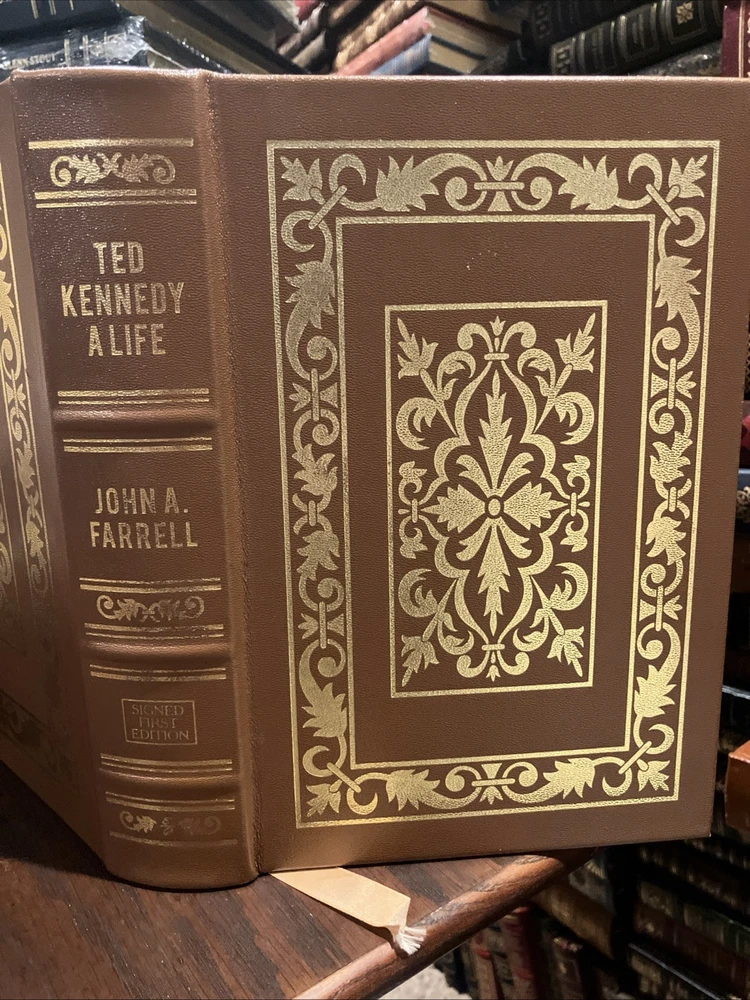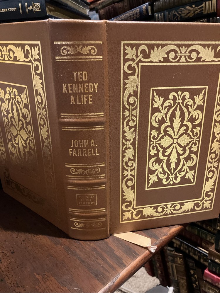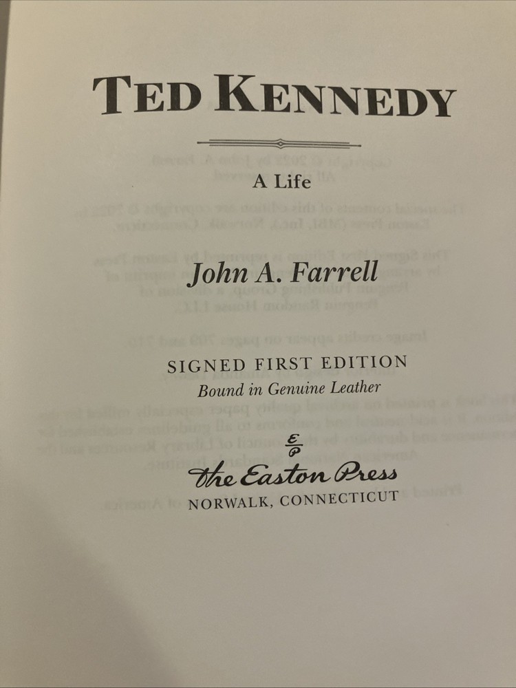 Easton Press leather edition of John A. Farrell's "Ted Kennedy: A Life, a COLLECTOR'S edition, one of the SIGNED FIRST EDITION series, Personally Signed by John A. Farrell, Number 3 of 300 copies, published in 2022. Bound in tan leather, the book has camel tan moire silk end leaves, acid-free paper, Symth-sewn binding, a satin book marker, hubbed spine, gold gilding on three edges---in FINE condition. Edward Moore Kennedy, who lived from 1932-2009, was an American lawyer and politician from Massachusetts who served as a U.S. Democratic Senator from 1962 until his death. The ninth child of Joseph and Rose Fitzgerald Kennedy, he was a member of a prominent Irish American family. His older brother John asked to be the newborn's godfather, a request the parents honored. As a child he was frequently uprooted and attended 10 schools by the age of eleven. He was an altar boy at St. Joseph's Church and was seven when he received his First Communion from POPE PIUS XII in the Vatican. He and his family lived in London in the late 1930s when his father was the Ambassador to the Court of St. James, but Rose returned to the U.S. when the Germans began bombing London. Ted attended Harvard where he was a mediocre student but excelled at football. He was 6'2" tall, with broad shoulders, a thick head of hair and hairy chest---and drop-dead handsome. H e was also on the tennis team and was in drama, debate and glee club. He always drove one of the nicest cars on campus. In 1951, he enlisted in the U.S. Army after being expelled from Harvard for cheating on a Spanish exam. After his military service, he returned to Harvard where he graduated and later graduated from the University of Virginia where he had to study "four times as hard and four times as long" as other students to keep up. Before he married Joan Bennett in 1958 at age 26, he had "bedded" scores of women in Europe and the U.S. Ted was the younger brother of President John F. Kennedy and U.S. Attorney General Robert F. Kennedy. In 1969, Senator Kennedy had the Chappaquiddick incident which resulted in the death of Mary Jo Kopeche. He pleaded guilty of leaving the scene and received a two-year suspended sentence. The incident and its aftermath hindered his chances of becoming president--although he ran for the Democratic Party 's nominee but lost to the incumbent president, Jimmy Carter. Kennedy was known for his oratorial skills and his cry for modern American liberalism were among his best-known speeches. He championed interventionist government that emphasized economic and social justice. Over the course of his Senate career, he made efforts to enact universal health care. He was the second most senior member of the Senate when he died and ranked fifth for continuous service as a senator. Although h e was often arrested for reckless driving, he was fun-loving and the "life of the party" and with his "Kennedy smile" and charming personality, he won hearts and even after marriage, women pursued him relentlessly and he often accommodated. He and Joan became parents to three children, Kara, Edward, and Patrick. Ted and Joan divorced and during the 1980s bachelor Kennedy had "female friends" from his generation. In 1991, Ted married Victoria Reggie, a talented, thirty-seven-year old lawyer and mother of two children. Victoria was with Ted when he hosted Gorbachev at the John F. Kennedy Library. He was a fine step- father, playing cards with Curran and Caroline and showing up at their sports event. Ted and Vicki were dog lovers and at the office Christmas Party, one year they dressed as Scarlet and Rhett and in 1993, they dressed as Beauty and the Beast. There were lame jokes about how he had been tamed, and "the horns he wore." Kennedy felt that "in life. . . a lot of is . . .being in the right place at the right time." "At heart he is a pragmatist," Hillary Clinton's aides advised her in a memo," and the bottom line for him is enacting health care reform." His brothers called Ted "the hardest- working one of the Kennedy clan." Jackie Kennedy Onassis wrote after Ted had walked her daughter, Caroline, down the wedding aisle: "On you, the carefree youngest brother, fell a burden a hero would have begged to have been spared." "We're all going to make it because you're always there with your love." He was buried with John and Jacqueline, and Robert, on the hillside in Arlington, between two maple trees. "He was not perfect, far from it, Ted. Jr. told the mourners. "But my father believed in redemption." Barrack Obama's eulogy conveyed a similar sentiment and a selection from one of Kennedy's favorite poems by William Wordsworth. 737 pages, including an Index. I offer combined shipping.