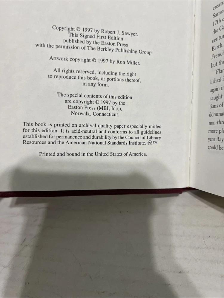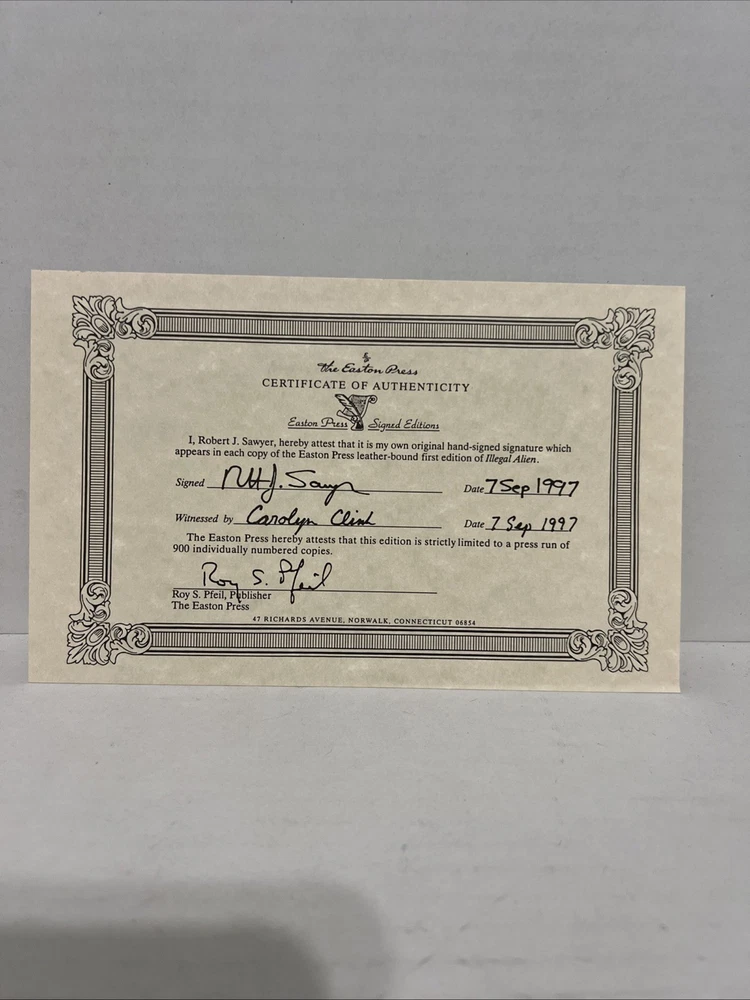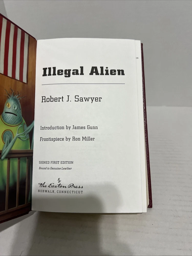 This limited edition Easton Press book, "Illegal Alien" by Robert J. Sawyer, is a must-have for any science fiction collector. The book is beautifully bound in leather and is in near mint condition. It features the signature of the author and is a valuable addition to any library. The book is written in English and is published by Easton Press. It is categorized under "Books & Magazines" and "Antiquarian & Collectible". The book is about reference and the topic is science fiction. The character family is literature. The book was manufactured in the United States.