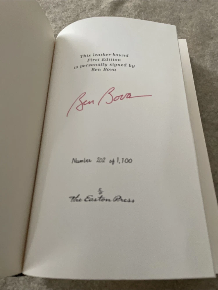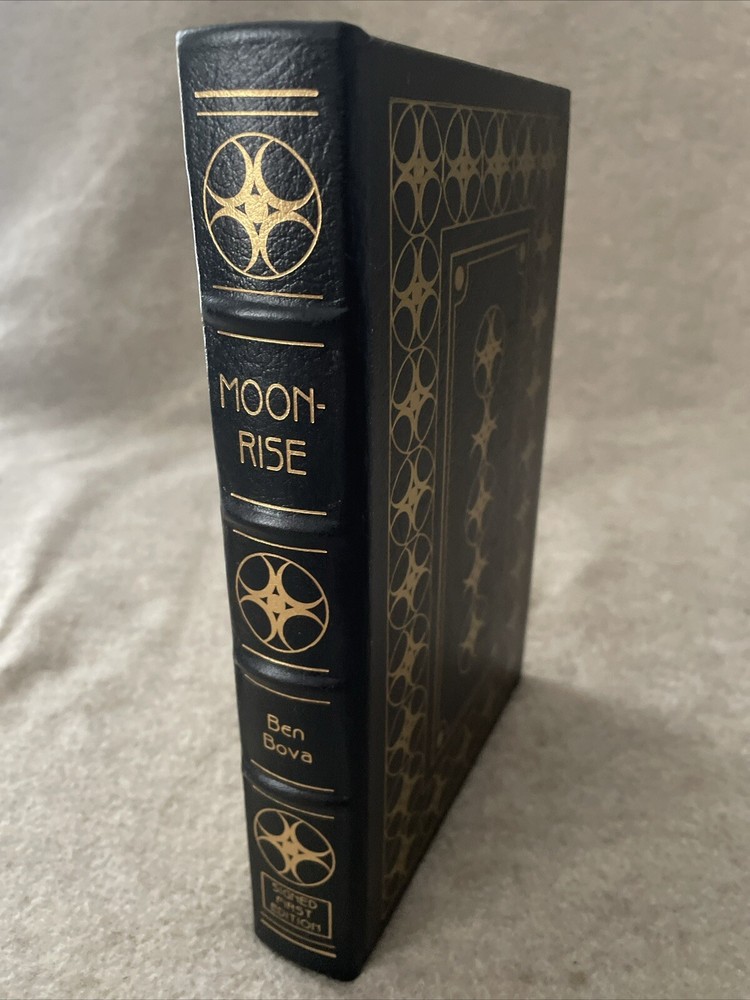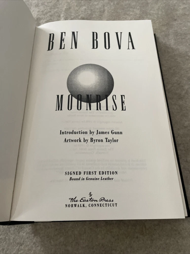 Easton Press Masterpieces of Science Fiction Series Moonrise by Ben Bova Signed First Edition There are no book plates in the book. It comes with the collector's notes. This book is in near mint condition with no wear. The gold on the covers shows no wear. The end pages show no fading. The gilt on the edge of the pages is in almost perfect condition with a light scratch on the side . Please see photos. We try to describe as accurately as possible so you will be satisfied with your purchase. We have more books from this set on eBay and we would be happy to combine on shipping to save you money. All books are sent with insurance via USPS Media Mail.