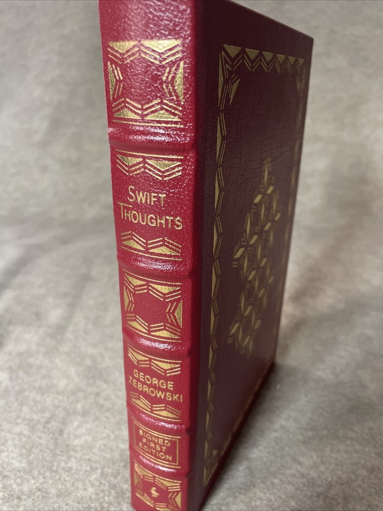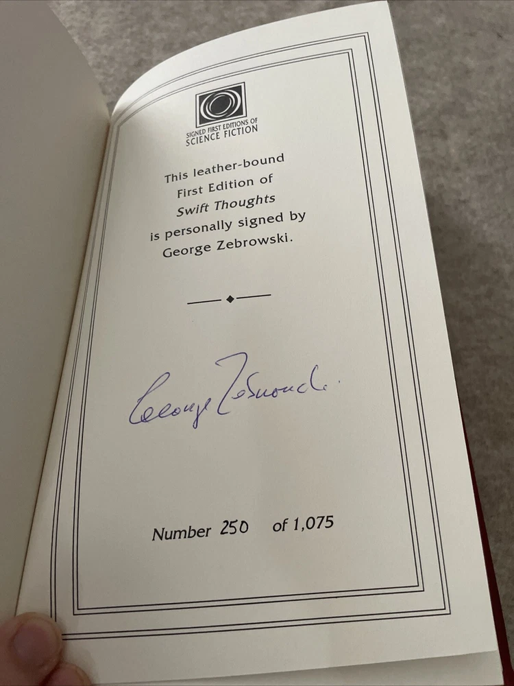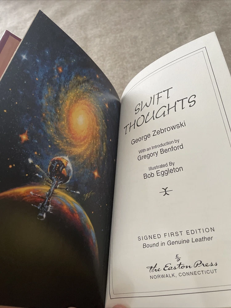 Easton Press Masterpieces of Science Fiction Series Swift Thoughts by George Zebrowski Signed First Edition There are no book plates in the book. It comes with the collector's notes. This book is in mint condition with no wear. The gold on the covers shows no wear. The end pages show no fading. The gilt on the edge of the pages is in perfect condition. Please see photos. We try to describe as accurately as possible so you will be satisfied with your purchase. We have more books from this set on eBay and we would be happy to combine on shipping to save you money. All books are sent with insurance via USPS Media Mail.