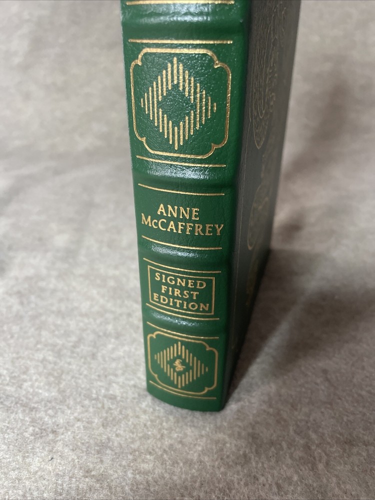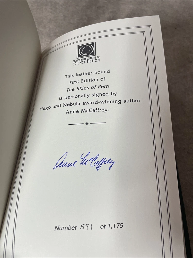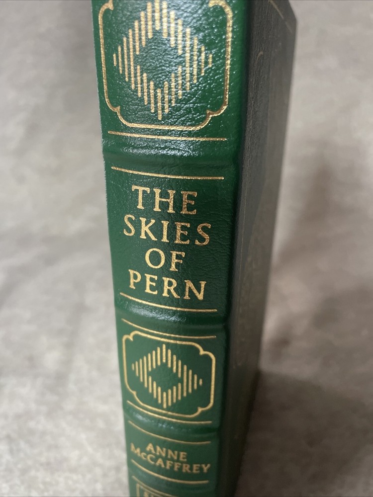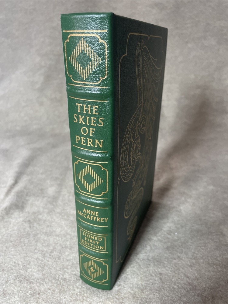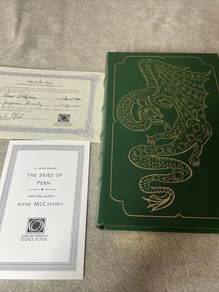 Easton Press Masterpieces of Science Fiction Series The Skies of Pern by Anne McCaffrey Signed First Edition There are no book plates in the book. It comes with the collector's notes. This book is in mint condition with no wear. The gold on the covers shows no wear. The end pages show no fading. The gilt on the edge of the pages is in perfect condition. Please see photos. We try to describe as accurately as possible so you will be satisfied with your purchase. We have more books from this set on eBay and we would be happy to combine on shipping to save you money. All books are sent with insurance via USPS Media Mail.
