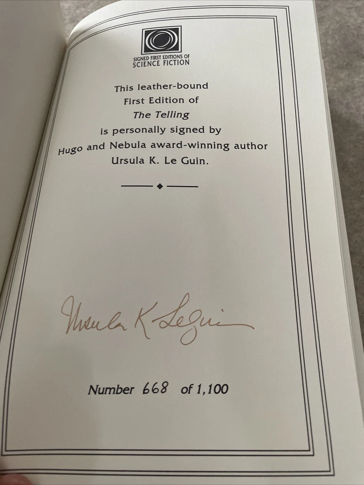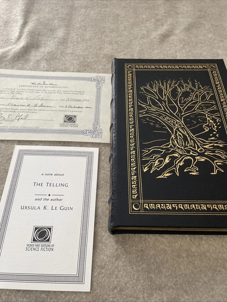 Easton Press Masterpieces of Science Fiction Series The Telling by Ursula K. LeGuin Signed First Edition There are no book plates in the book. It comes with the collector's notes. This book is in near mint condition with no wear. The gold on the covers shows no wear. The end pages show no fading. The gilt on the edge of the pages is in almost perfect condition with a light scratch on the side . Please see photos. We try to describe as accurately as possible so you will be satisfied with your purchase. We have more books from this set on eBay and we would be happy to combine on shipping to save you money. All books are sent with insurance via USPS Media Mail.