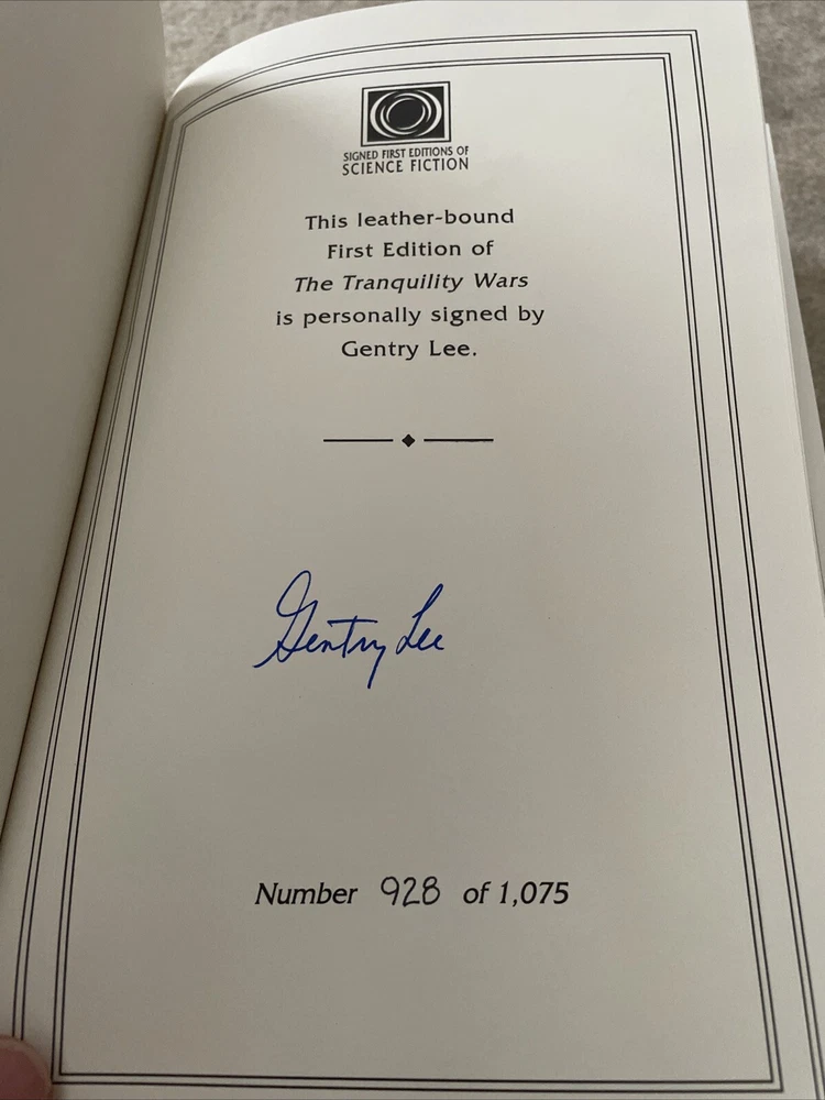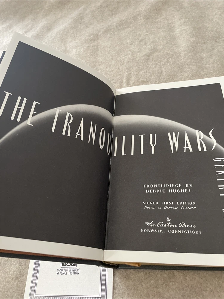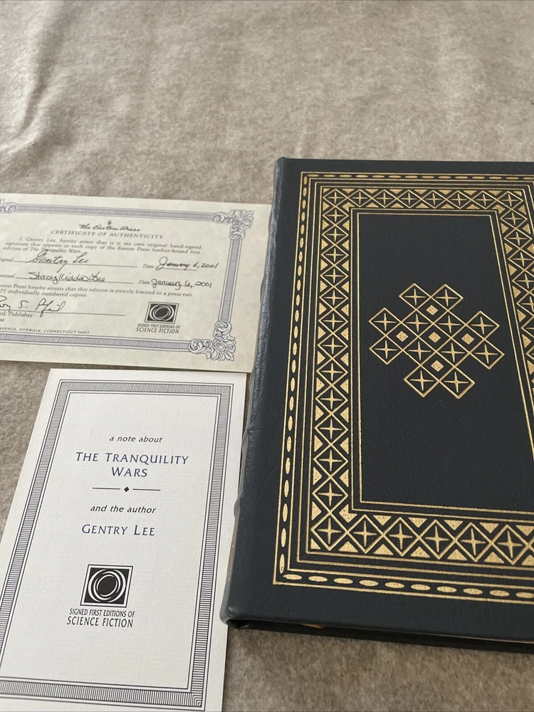 Easton Press Masterpieces of Science Fiction Series The Tranquility Wars by Gentry Lee Signed First Edition There are no book plates in the book. It comes with the collector's notes. This book is in near mint condition with no wear. The gold on the covers shows no wear. The end pages show no fading. The gilt on the edge of the pages is in almost perfect condition with a scratch on the side. Please see photos. We try to describe as accurately as possible so you will be satisfied with your purchase. We have more books from this set on eBay and we would be happy to combine on shipping to save you money. All books are sent with insurance via USPS Media Mail.