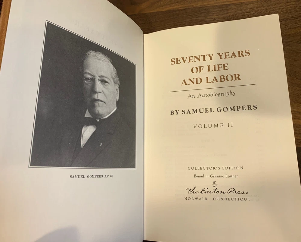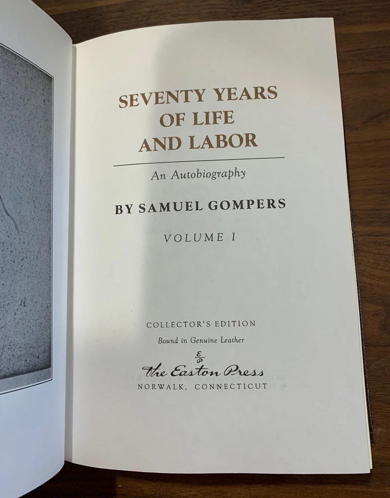 Seventy Years of Life and Labor - Samuel Gompers 2 Volume Collector's Edition Hardcover Norwalk, Connecticut Easton Press, Leather Bound Limited Edition. Book accented in 22kt gold. Printed on archival paper with gilded edges. The endsheets are of moire fabric with a silk ribbon page marker. Smyth sewing and concealed muslin joints to ensure the highest quality binding. This book is in full leather with hubbed spines. Comes with (2) bookplates.