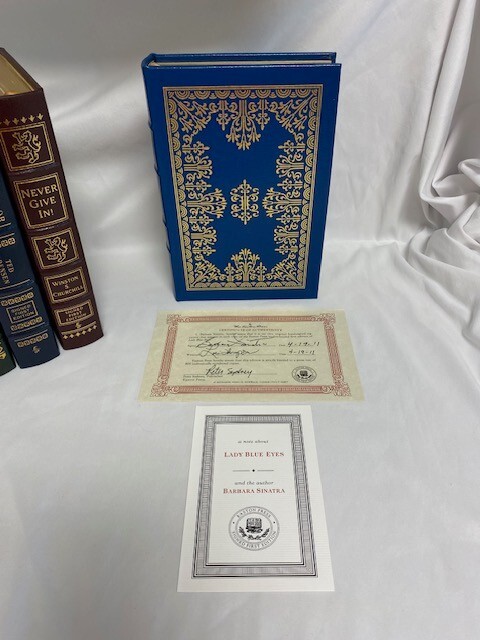 Thirty years after she first heard his voice singing on the jukebox at her local drive-in, Barbara Ann Blakely heard Frank Sinatra take the wedding vows that began his fourth, final, and most enduring marriage. In Lady Blue Eyes, Barbara Sinatra’s first public love letter to the husband she adored, she celebrates the sensational singer, possessive mate, sexy heartthrob, and devoted friend that she found in Frank. For more than two decades, Barbara was always by his side, traveling the globe and hosting glittering events for their famous friends, including presidents, kings, queens, Hollywood royalty, and musical legends. Among them were Sammy Davis, Jr., Princess Grace of Monaco, Bob Dylan, and Ronald Reagan. Each night, as Frank publicly wooed his bride with love songs from a concert stage, she’d fall in love with him all over again. From her own humble beginnings in a small town in Missouri to her time as a fashion model and her marriage to Zeppo Marx, Barbara Sinatra reveals a life lived with passion, conviction, and grace. A founder of the Miss Universe pageant and a onetime Vegas showgirl, she raised her only son almost single-handedly in often dire circumstances until, after five years of tempestuous courtship, she and Frank committed to each other wholeheartedly. In stories that leap off the page, she takes us behind the scenes of her iconic husband’s legendary career and paints an intimate portrait of a man who was variously generous, jealous, witty, and wicked. Coupled with revealing insights about many of Frank’s celebrated songs, this is much more than the story of a showbiz marriage. It is a story of passion and of a deep and lifelong love. Signed 791 of 800 by Barbara Sinatra. "Like New" condition. Well-kept in smoke free, pet free home.