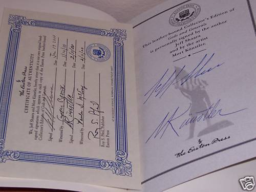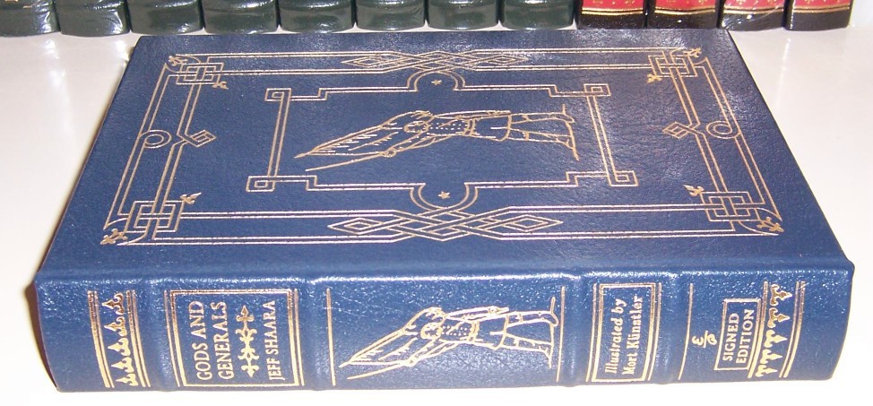 Easton Press Signed Collector's Edition Easton Press GODS AND GENERALS by Jeff Shaara, illustrated by Mort Kunstler personally signed by the author Jeff Shaara and by the artist Mort Kunstler with Note and COA out-of-print, do not miss out this good deal Copyright by The Easton Press hubbed spine, bound in premium full leathers distinctive cover design, beautiful illustrations handsome, readable typefaces, permanent satin ribbon page marker elegant gilded page edges, endsheets of rich moire fabric thread-sewn pages for durability and strength, long-lasting high quality, acid-neutral paper CONDITION DESCRIPTION: Near fine and unread condition, with collector's Note and Certificate of Authenticity, exquisitely bound in genuine leather. This copy could be a precious addition to your family library. SHIPPING / HANDLING: Book(s) will be handled/packed very safely, and shipped via USPS media mail with delivery confirmation.