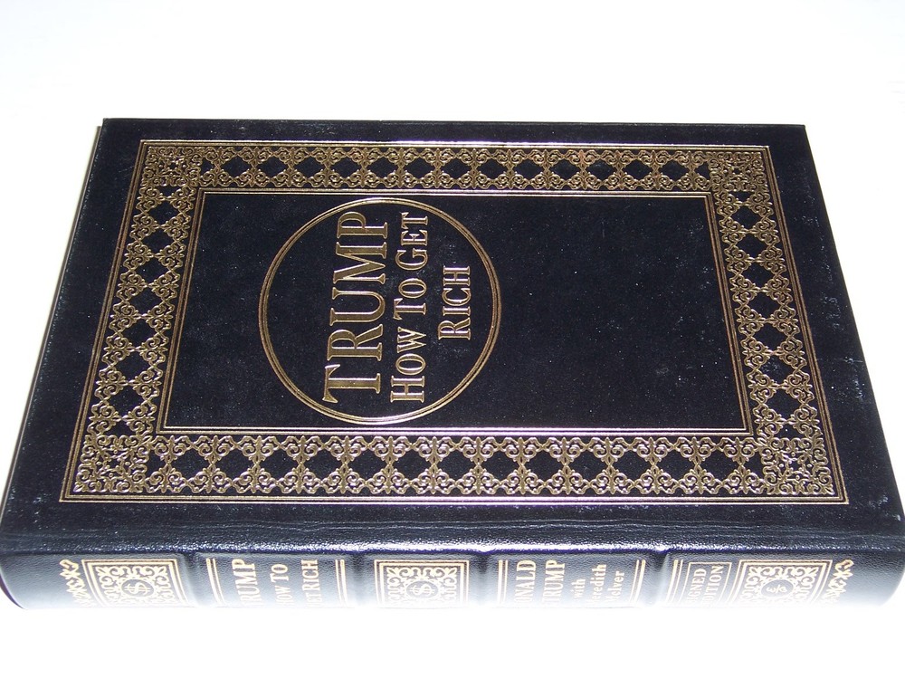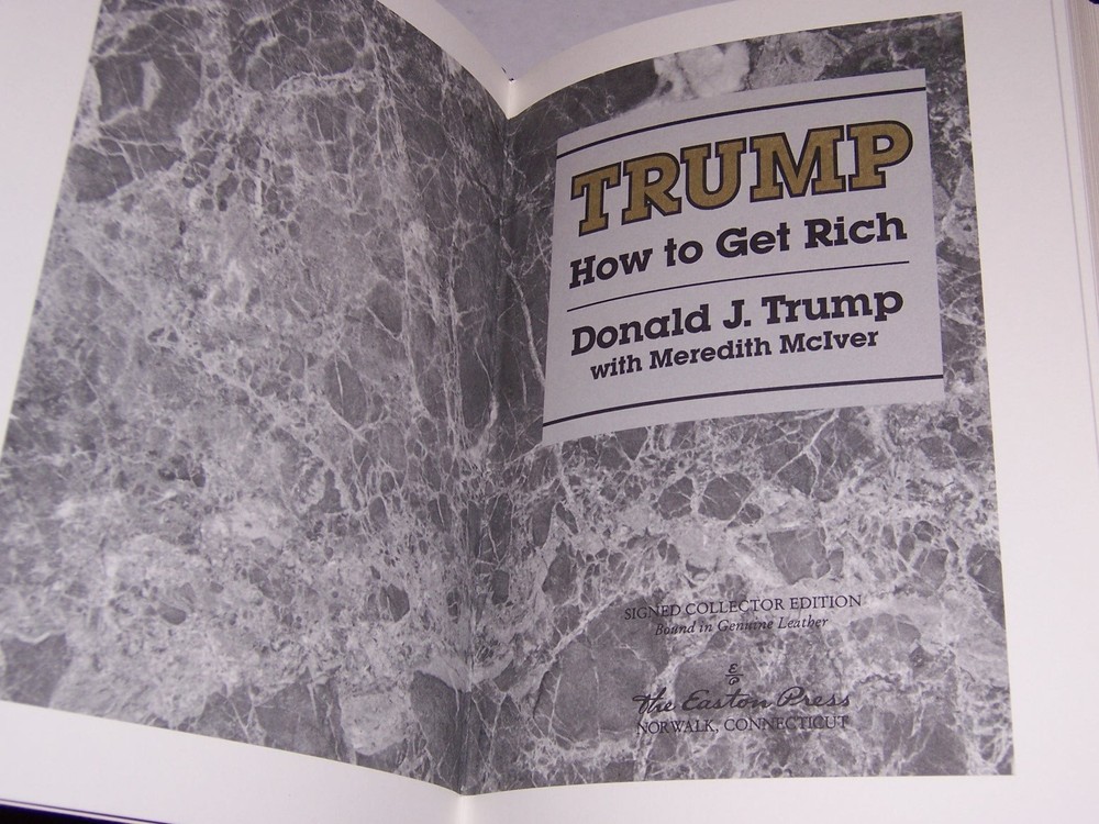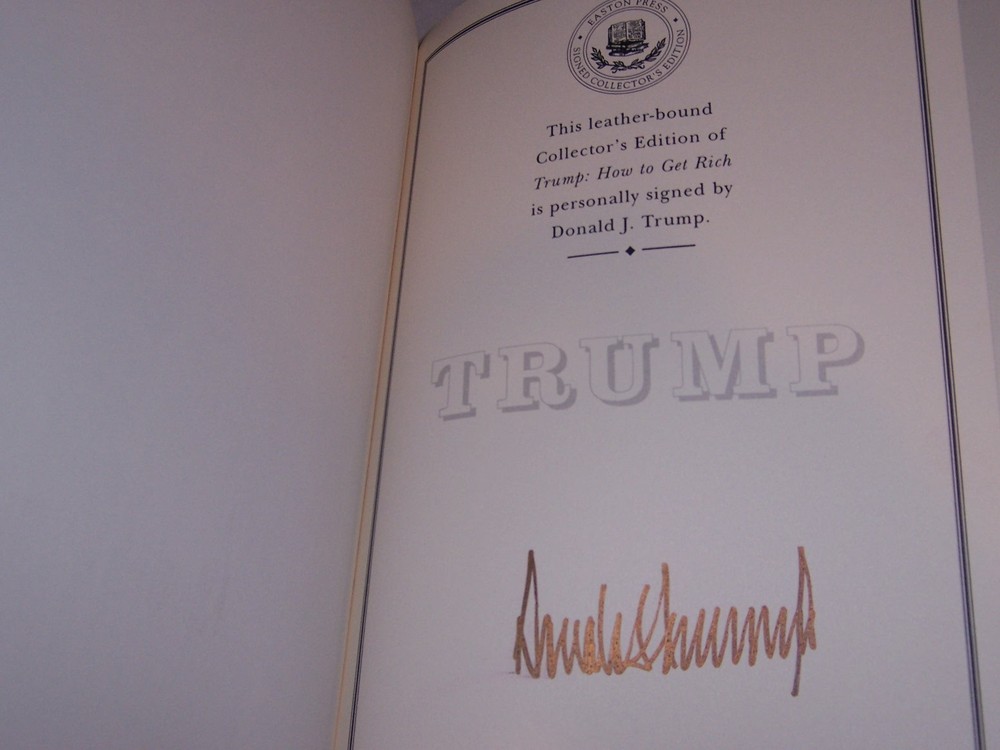 Collector's Signed Edition Easton Press HOW TO GET RICH personally signed by Donald J. Trump black leather hardcover with special cover design bound in genuine leather do not miss this great deal Published by Easton Press hubbed spine, bound in premium full leathers distinctive cover design, beautiful illustrations handsome, readable typefaces, permanent satin ribbon page marker elegant gilded page edges, endsheets of rich moire fabric thread-sewn pages for durability and strength, long-lasting high quality, acid-neutral paper CONDITION DESCRIPTION: Like new and unread condition, with blank attached bookplate, shiny gold page edging, beautiful bright endleaves, and satin ribbon page marker. It is a very special books to be added to your personal collection. SHIPPING / HANDLING: Book(s) will be handled/packed very safely, and shipped via USPS media mail with delivery confirmation.