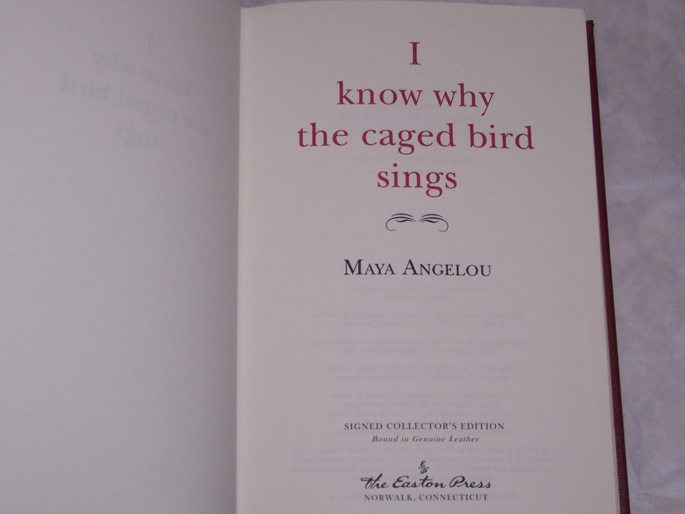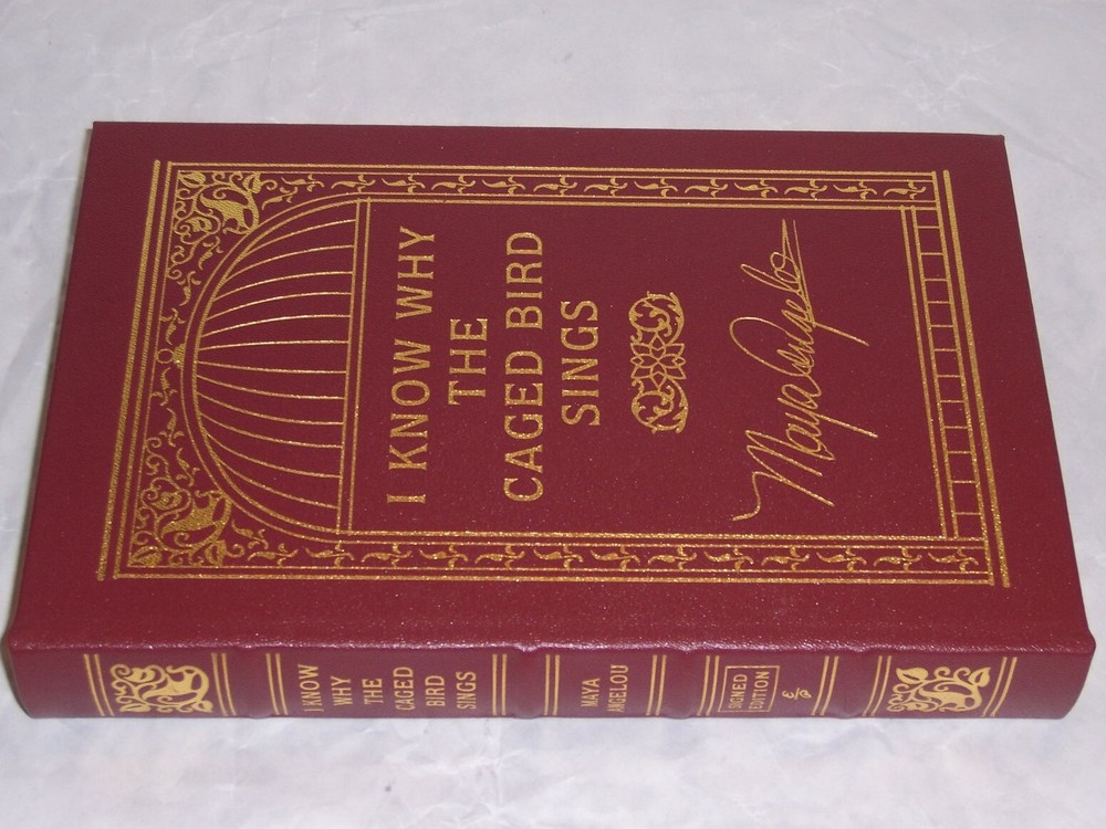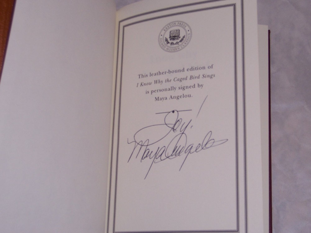 Signed Modern Classics Easton Press I KNOW WHY THE CAGED BIRD SINGS by Maya Angelou Red leather binding, golden cover design with decorations personally signed by Maya Angelou out-of-print, and Do not miss this once-in-life-time opportunity to acquire this precious collection Copyright by The Easton Press hubbed spine, bound in premium full leathers distinctive cover design, beautiful illustrations handsome, readable typefaces, permanent satin ribbon page marker elegant gilded page edges, endsheets of rich brown marble pattern thread-sewn pages for durability and strength, long-lasting high quality, acid-neutral paper CONDITION DESCRIPTION: this book is in like new condition, unread condition: binding is tight and gold page edging still shiny, beautiful bright endleaves and satin ribbon page marker. It will make a great addition to any personal library SHIPPING / HANDLING: Book(s) will be handled/packed very safely, and shipped via USPS media mail with delivery confirmation.