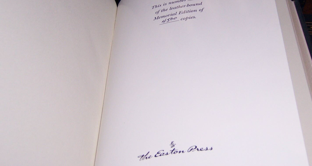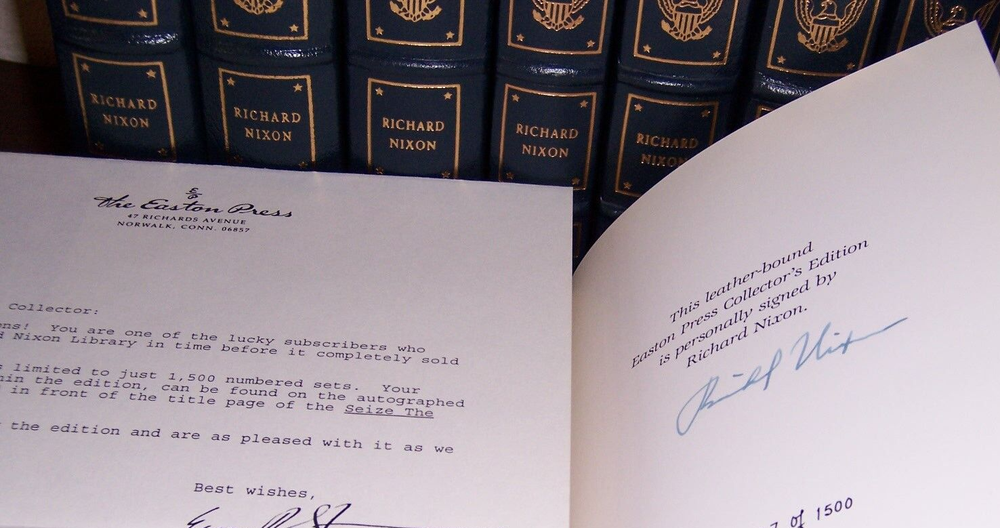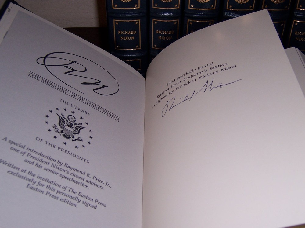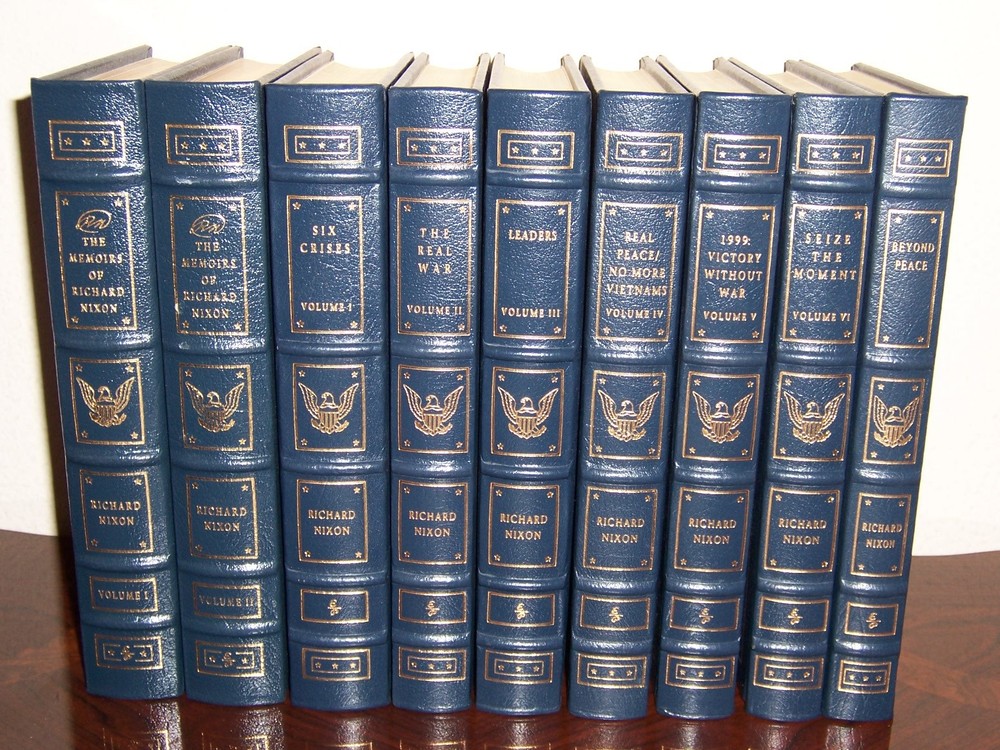 The most comprehensive and authorative works by the US president Easton Press LIBRARY & MEMOIRS OF RICHARD NIXON in 9 volumes by Richard Nixon Uniform navy-blue binding with a US Presidential seal stamped on the front with many photos and illustrations BOUND IN GENUINE LEATHER Copyright by Easton Press Hubbed Spine, Bound in Premium Full Leather Distinctive Cover Design, Profusely Illustrated Moire Endleaves, Satin Ribbon Page Marker Accented in Real 22KT Gold, Gilt Page Edges Smyth-sewn Pages for Strength and Durability Long-lasting, High Quality Acid-neutral Paper LIST OF TITLES: complete in nine volumes: Memoirs of Richard Nixon, Vol. I ( Signed by President Richard Nixon, with a special introduction by Raymond K Price, Jr.) Memoirs of Richard Nixon, Vol. II Vol. I: Six Crises Volume II: The Real War Volume III: Leaders Volume IV: Real Peace: No More Vietnam Volume V: 1999: Victory Without War Volume VI: Seize The Moment (personally signed by Richard Nixon, No. 627 of 1,500 limited copies) Beyond Peace (No. 382 of the leather-bound Memorial Edition of 4500 copies) CONDITION DESCRIPTION: this set is in like new and unread condition: clean inside page, and binding is tight, beautiful bright endpapers and satin ribbon page marker. SHIPPING / HANDLING: The book will be shipped via USPS media mail with delivery confirmation, special care will be taken during packing to ensure you receive the books as described.