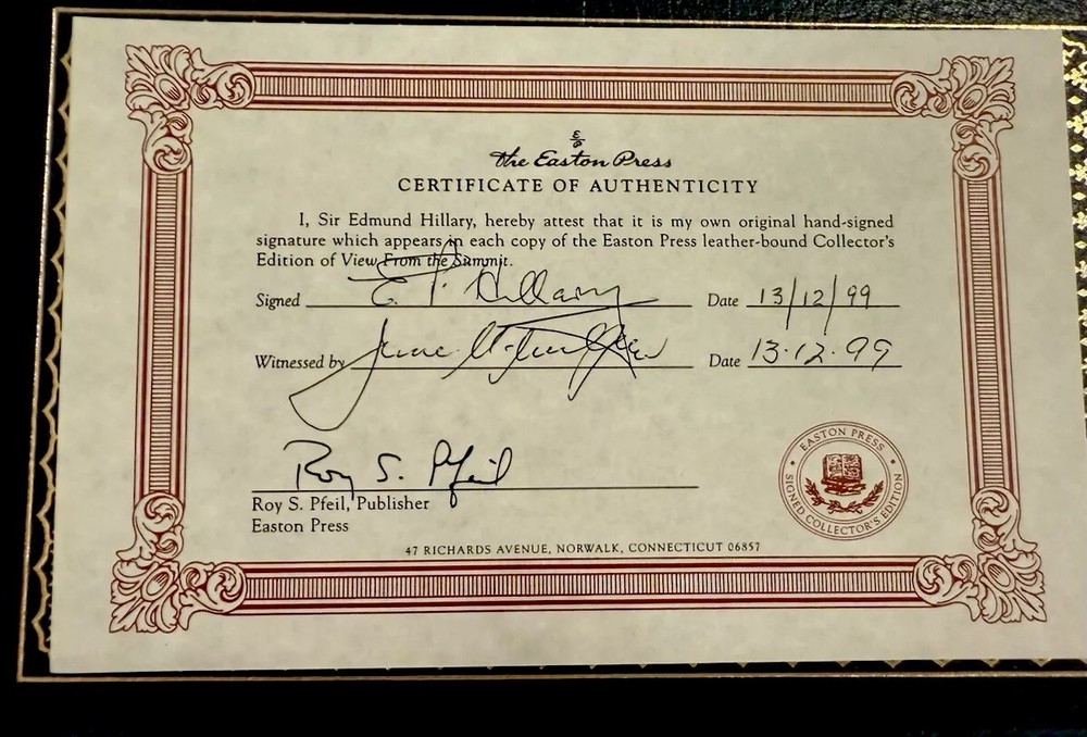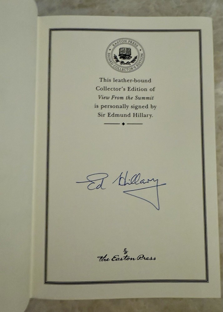 This is a rare and collectible edition of Edmund Hillary's autobiography, "A View From The Summit". This Easton Press edition is signed and numbered by the author himself, making it a valuable addition to any mountaineering or biography collection. The binding is made of high-quality leather, and the pages are printed in English. The book is categorized as an antiquarian and collectible item, and it is indeed a beautiful piece to display. It is perfect for those who are interested in the biography and autobiography of famous personalities. This limited edition is a must-have for any collector who wants to add a unique and valuable item to their collection.