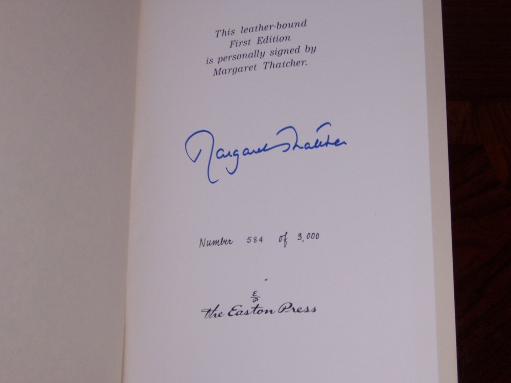 heirloom edition Easton Press PATH TO POWER by Margaret Thatcher personally SIGNED by Margaret Thatcher Distinct cover designs with decorations dimension 6 1/4" x 9 1/2” do not miss out this good deal Copyright by The Easton Press hubbed spine, bound in premium full leathers distinctive cover design, beautiful illustrations handsome, readable typefaces, permanent satin ribbon page marker elegant gilded page edges, endsheets of rich moire fabric thread-sewn pages for durability and strength, long-lasting high quality, acid-neutral paper CONDITION DESCRIPTION: Like new and unread condition, binding is tight and gold page edging still shiny, beautiful bright endleaves and satin ribbon page marker. This set could be a precious addition to your family library. SHIPPING / HANDLING: Book(s) will be handled/packed very safely, and shipped via USPS media mail with delivery confirmation.