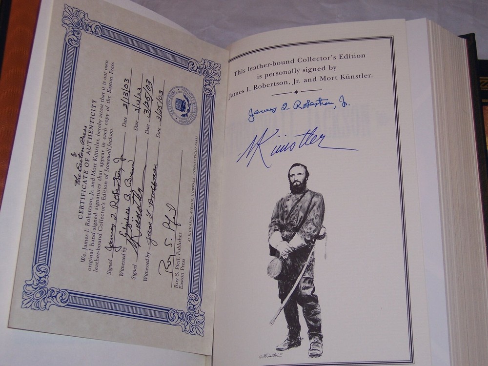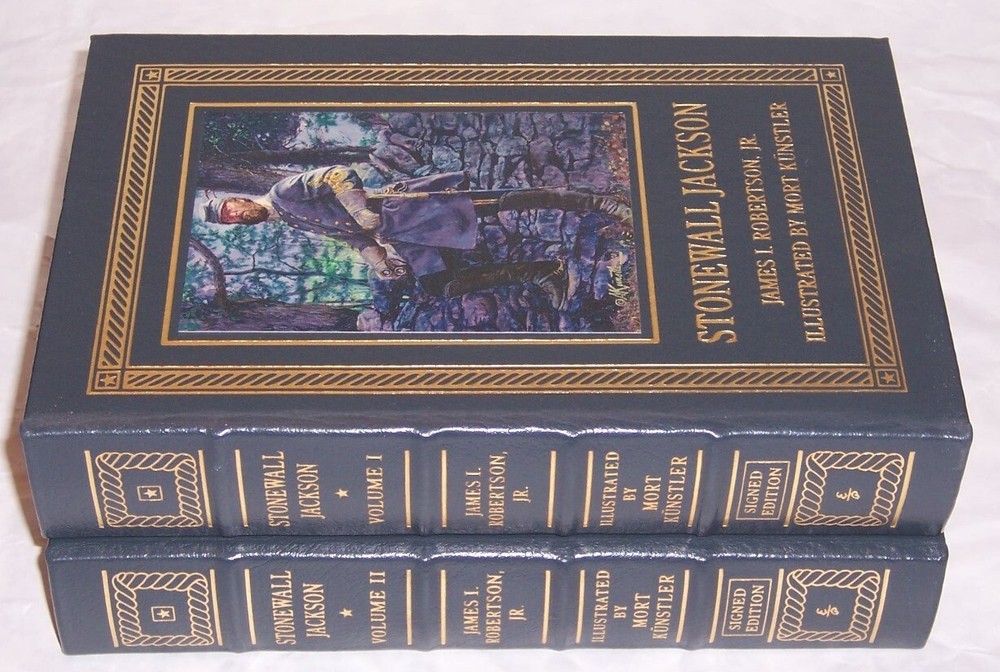 Heirloom Edition Easton Press Stonewall Jackson in 2 volumes by James Robertson Illustrated by Mort Kunstler This Leather-Bound Collector's Edition is personally signed by James Robertson and Mort Kunstler, with certificate of authenticity BOUND IN GENUINE LEATHER Copyright by Easton Press Hubbed Spine, Bound in Premium Full Leather Distinctive Cover Design, Profusely Illustrated Moire Endleaves, Satin Ribbon Page Marker Accented in Real 22KT Gold, Gilt Page Edges Smyth-sewn Pages for Strength and Durability Long-lasting, High Quality Acid-neutral Paper LIST OF TITLES: complete in 3 volume: Stonewall Jackson: The Man, The Soldier, The Legend, Vol. I Stonewall Jackson The Man, The Soldier, The Legend, Vol. II CONDITION DESCRIPTION: this set is in like new and unread condition: clean inside page, and binding is tight, beautiful bright endpapers and satin ribbon page marker. SHIPPING / HANDLING: The book will be shipped via USPS media mail with delivery confirmation, special care will be taken during packing to ensure you receive the books as described.
