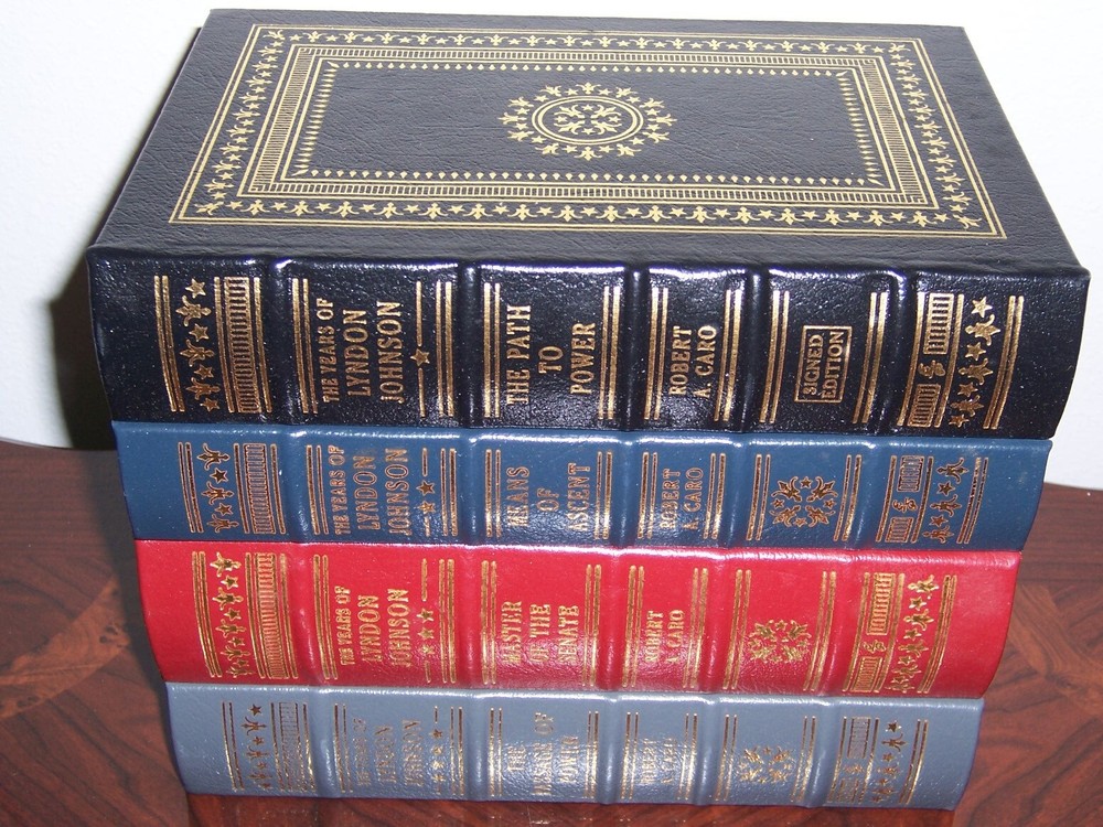Signed Collector's Edition Easton Press THE YEARS OF LYNDON JOHNSON in 4 volumes by Robert A Caro Matching multi-color binding, golden cover design with decorations Personally signed by Robert A Caro with certificate of authenticity (COA) measured by 6 1/4" x 9 1/2" out-of-print, and Do not miss this once-in-life-time opportunity to acquire this precious collection Copyright by The Easton Press hubbed spine, bound in premium full leathers distinctive cover design, beautiful illustrations handsome, readable typefaces, permanent satin ribbon page marker elegant gilded page edges, endsheets of rich brown marble pattern thread-sewn pages for durability and strength, long-lasting high quality, acid-neutral paper LIST OF TITLES: a complete series in 4 leather-bound volumes: 1. Path to Power, Personally signed by Robert A Caro 2. Means of Ascent 3. Master of the Senate 4. Passage of Power CONDITION DESCRIPTION: this set is in like new condition, unread condition: binding is tight and gold page edging still shiny, beautiful bright endleaves and satin ribbon page marker. It will make a great addition to any Civil War buff's library SHIPPING / HANDLING: Book(s) will be handled/packed very safely, and shipped via USPS media mail with delivery confirmation.