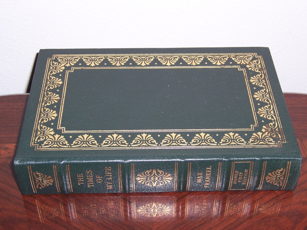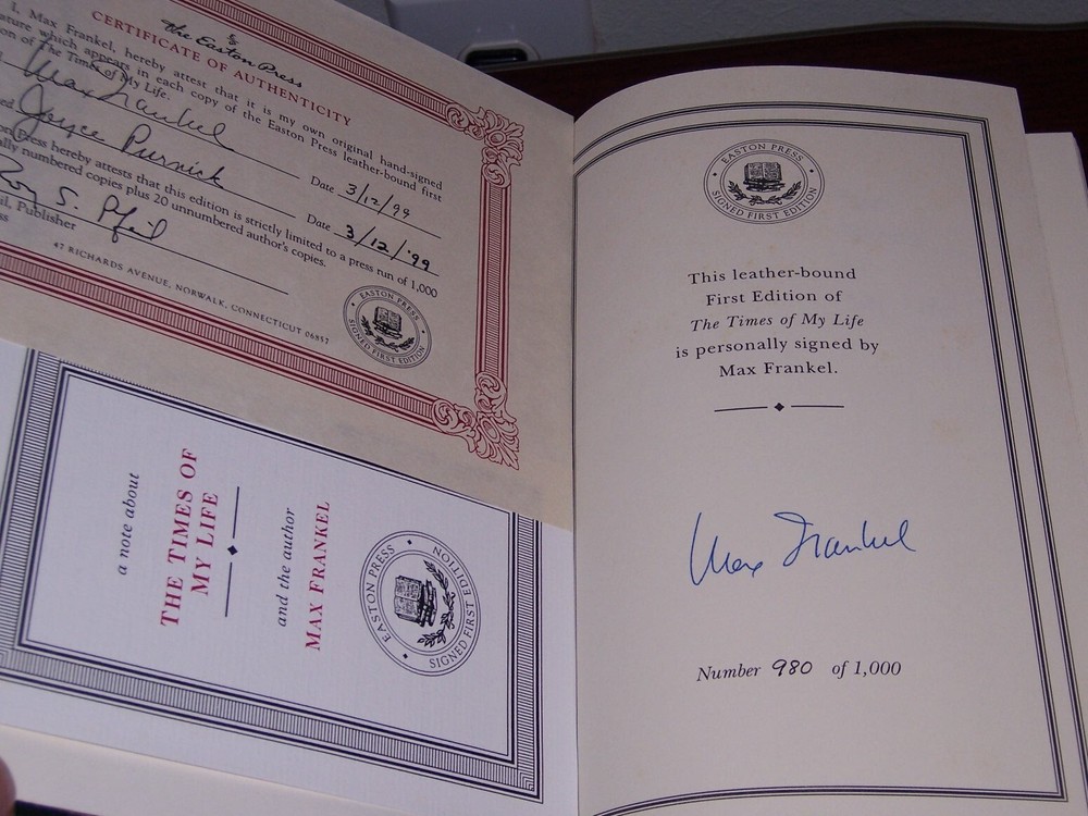 Signed First Edition Easton Press The Times of My Life by Max Frankel personally SIGNED by Max Frankel with certificate of authenticity (COA) Distinct cover designs with decorations Number 980 of 1000 limited copies do not miss out this good deal Copyright by The Easton Press hubbed spine, bound in premium full leathers distinctive cover design, beautiful illustrations handsome, readable typefaces, permanent satin ribbon page marker elegant gilded page edges, endsheets of rich moire fabric thread-sewn pages for durability and strength, long-lasting high quality, acid-neutral paper CONDITION DESCRIPTION: Like new and unread condition, binding is tight and gold page edging still shiny, beautiful bright endleaves and satin ribbon page marker. This set could be a precious addition to your family library. SHIPPING / HANDLING: Book(s) will be handled/packed very safely, and shipped via USPS media mail with delivery confirmation.