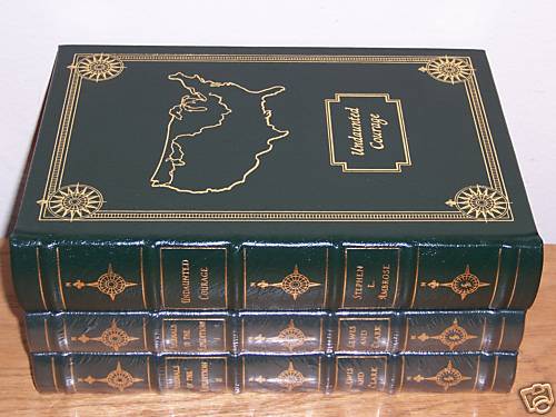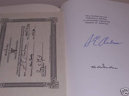 Easton Press Signed Collector's Edition Easton Press Undaunted Courage and the Lewis & Clark Collection in 3 volumes illustrated with photos and maps out-of-print, do not miss out this good deal Copyright by The Easton Press hubbed spine, bound in premium full leathers distinctive cover design, beautiful illustrations handsome, readable typefaces, permanent satin ribbon page marker elegant gilded page edges, endsheets of rich moire fabric thread-sewn pages for durability and strength, long-lasting high quality, acid-neutral paper LIST OF TITLES: a complete series in 3 volumes: UNDAUNTED COURAGE, personally signed by Stephen Ambrose, with Certificate of Authenticity JOURNALS OF THE EXPEDITION 1803-1806, Vol I & II, by Meriwether Lewis and William Clark, edited by Nicholas Biddle with an introduction by John Bakeless CONDITION DESCRIPTION: Like new and unread condition, exquisitely bound in genuine leather. These could be a precious addition to your family library. SHIPPING / HANDLING: Book(s) will be handled/packed very safely, and shipped via USPS media mail with delivery confirmation.