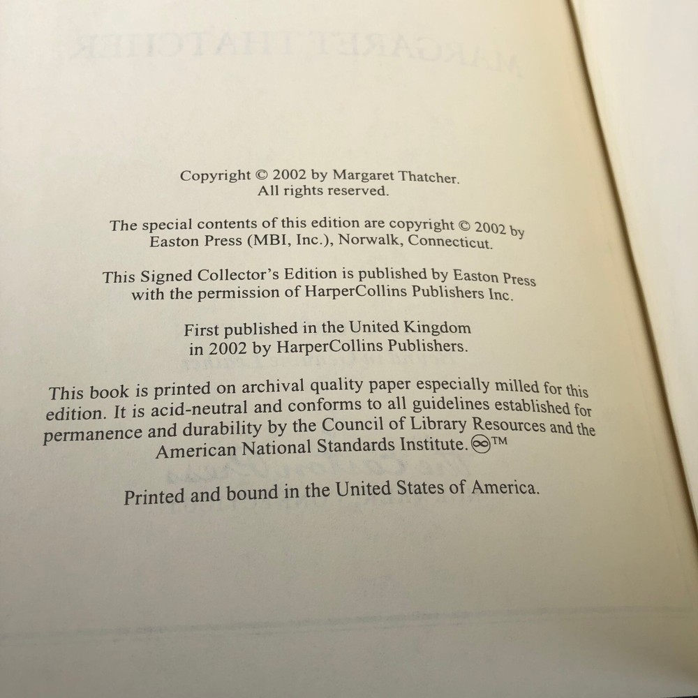 This Easton Press book titled "Statecraft" is a rare find for any political enthusiast. It features the signature of former British Prime Minister Margaret Thatcher and comes with a Certificate of Authenticity. The book is bound in high-quality leather and is written in English. The book covers various political topics and is a great addition to any collection. It was published by Easton Press in the United States and is an excellent conversation piece for any book lover. Get your hands on this unique item today! The item may have marks on the cover due to storage and a visible mark on the gilted edge as pictured.