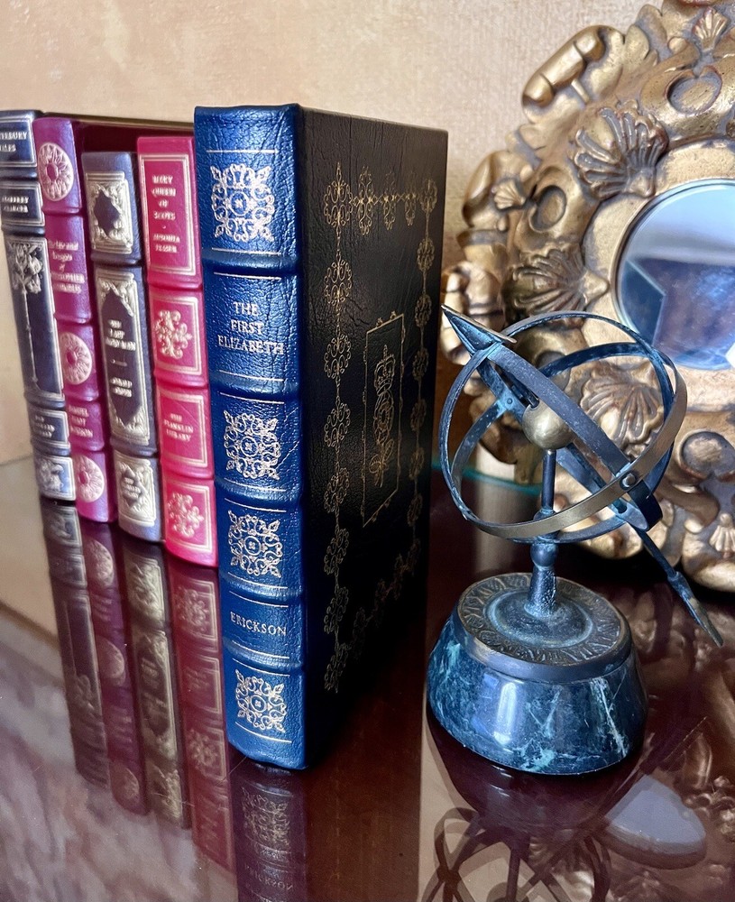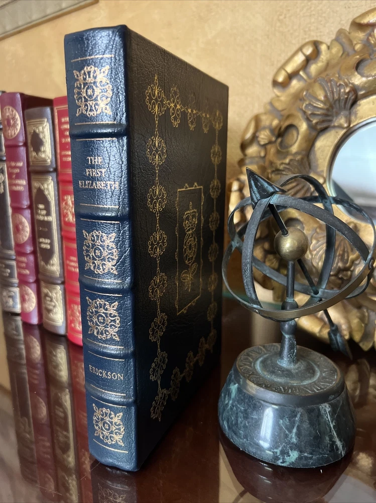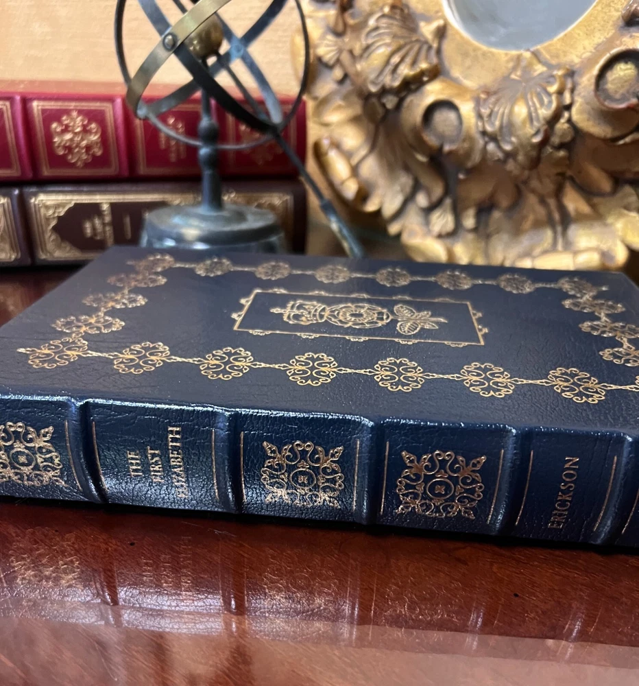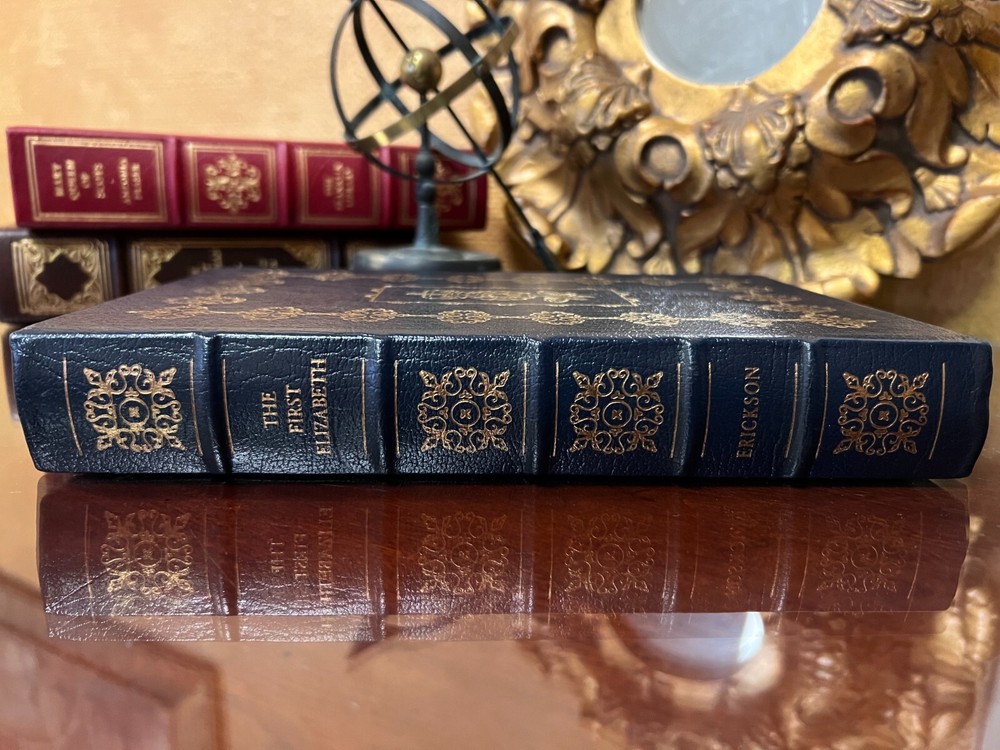 Carolly Erickson THE FIRST ELIZABETH Easton Press First Edition 1st Printing. Leather bound Collector's Edition, 1989 Fine condition. Printed on archival paper with gilded edges. The endsheets are of moire fabric with a silk ribbon page marker. Smyth sewing and concealed muslin joints to ensure the highest quality binding. This book is in full leather with hubbed spines. About The First Elizabeth: In this remarkable biography, Carolly Erickson brings Elizabeth I to life and allows us to see her as a living, breathing, elegant, flirtatious, diplomatic, violent, arrogant, and outrageous woman who commands our attention, fascination, and awe. With the special skill for which she is acclaimed, Carolly Erickson electrifies the senses as she evokes with total fidelity the brilliant colors of Elizabethan clothing and jewelry, the texture of tapestries, and even the close, perfumed air of castle rooms. Erickson demonstrates her extraordinary ability to discern and bring to life psychological and physical reality.
