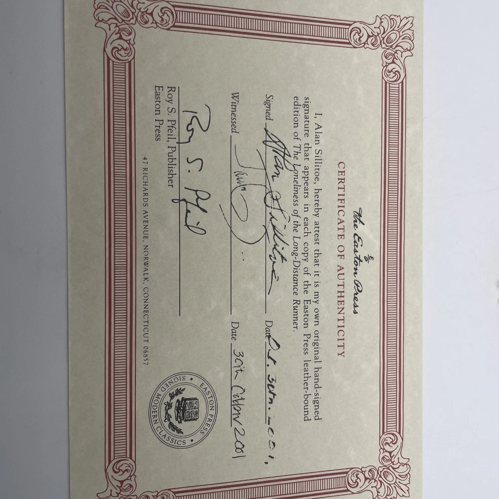 Easton Press THE LONELINESS OF THE LONG-DISTANCE RUNNER Alan Sillitoe Signed COA. Smoke and pet free home!