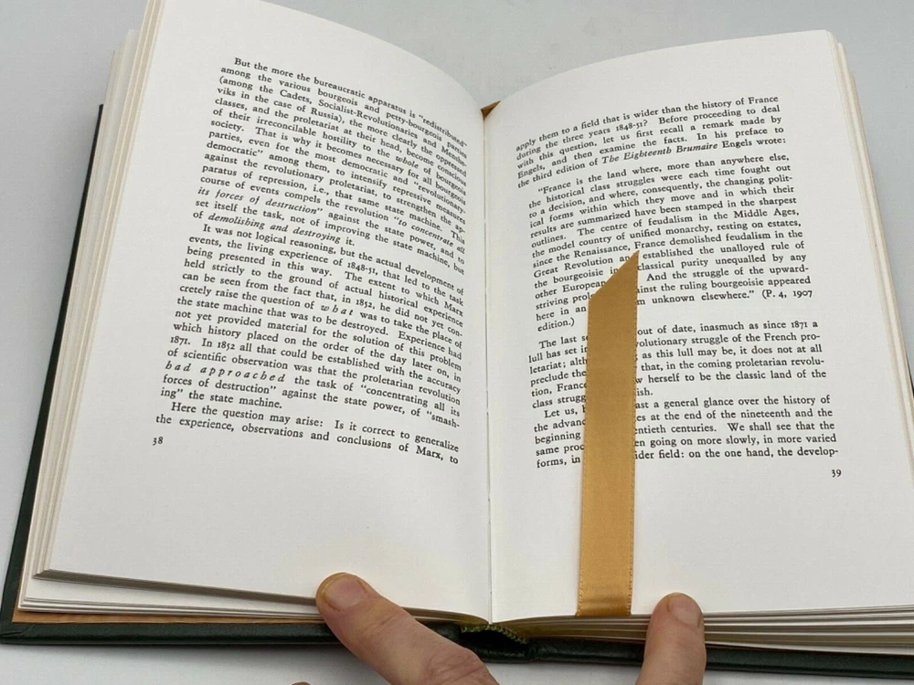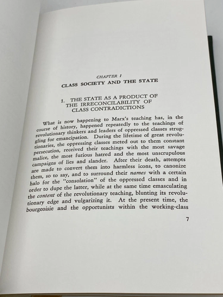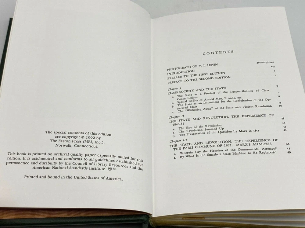 MAKES THE PERFECT GIFT FOR ANY FAN OF MARXISM / COMMUNIST THOUGHT & PHILOSOPHY ** PLEASE READ : Mahalo for taking the time to look at our listing. We truly appreciate it. We always do our BEST to give you the most accurate description of these beautiful books. If, however, you have any SPECIFIC questions about the SIZE of the book, NUMBER of pages, TYPE of leather, SMELL or FEEL of the book, PLEASE email us through EBay’s mail system BEFORE you bid, and we will be HAPPY to give you more information. We want you to be completely happy with your purchase and keep you as our customers for years to come!** DESCRIPTION: Easton Press full-leather LONG OUT OF PRINT edition of THE STATE AND REVOLUTION by LENIN. THIS IS A SCARCE VINTAGE HEIRLOOM EASTON WITH LAVISH DEEP GILT IMPRESSIONS TO THE BOARDS AND SPINE. IT IS ONE OF THE MOST HIGHLY-PRIZED EDITIONS OF THIS GREAT BOOK OF HISTORY. 🍍 NOT INCLUDED... 😃 ABOUT THE BOOK: The State and Revolution is a book by Vladimir Lenin describing the role of the state in society, the necessity of proletarian revolution, and the theoretic inadequacies of social democracy in achieving revolution to establish the dictatorship of the proletariat. CONDITION: Book is in LIKE NEW condition for its age with only a few faint minor rubs to the gilt page ends (SEE PICS FOR FURTHER DETAILS). NO ATTACHED BOOKPLATES, WRITING FROM PREVIOUS OWNER, ETC. It is a BEAUTIFUL EDITION. SHIPPING: FREE TO US ADDRESSES ONLY. INTERNATIONAL $ based on location. WE SHIP PRIORITY MAIL & PACK VERY WELL. Please check out our other listings of Easton Press, Franklin Library, Limited Editions Club, First Edition Library, International Collectors Library, Heritage Press, and Folio Society editions. WE DO COMBINE SHIPPING IF YOU PURCHASE MORE THAN ONE COPY. Mahalo for looking at our listings! By bidding/purchasing this item, you are helping a very grateful family who sends you our WARMEST ALOHA & MAHALO!