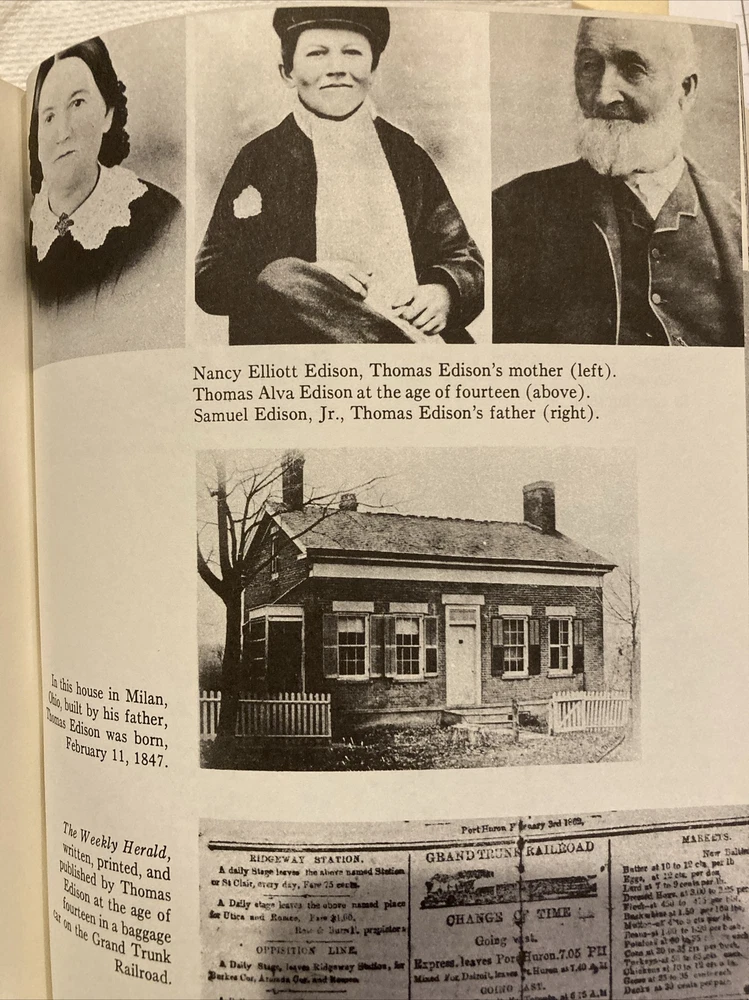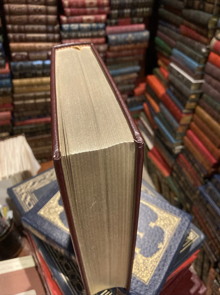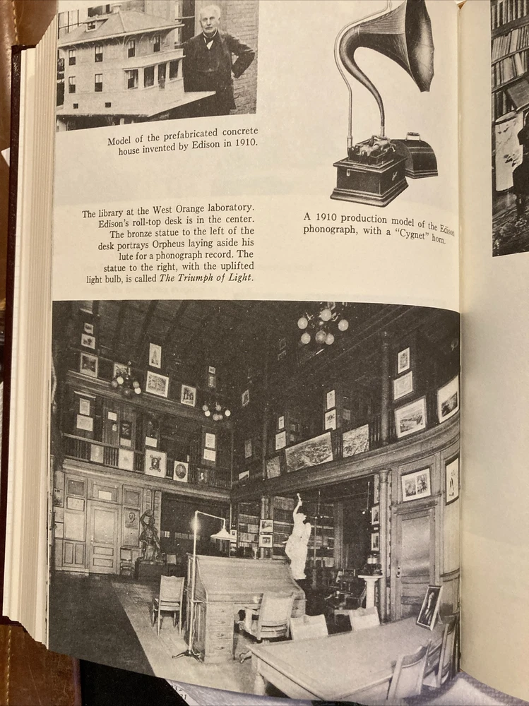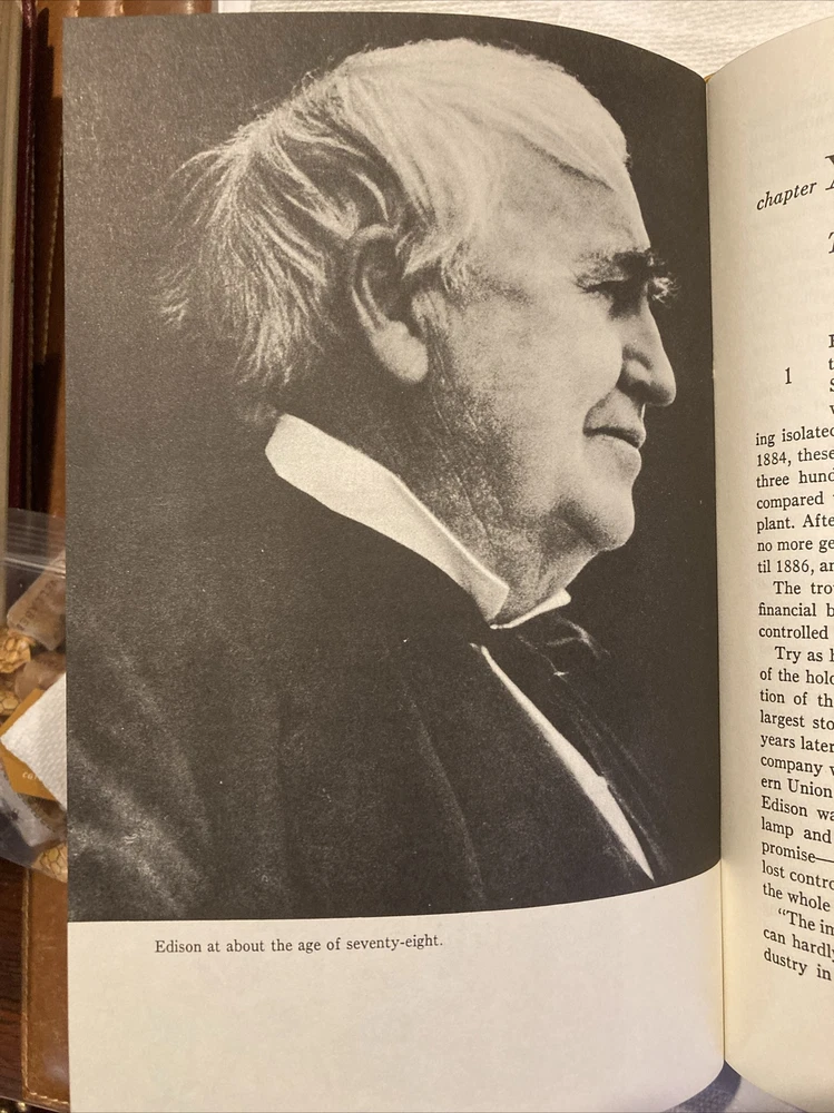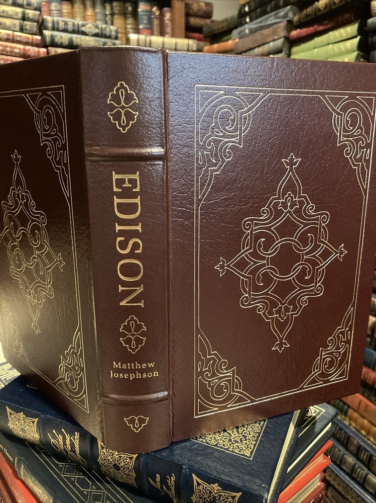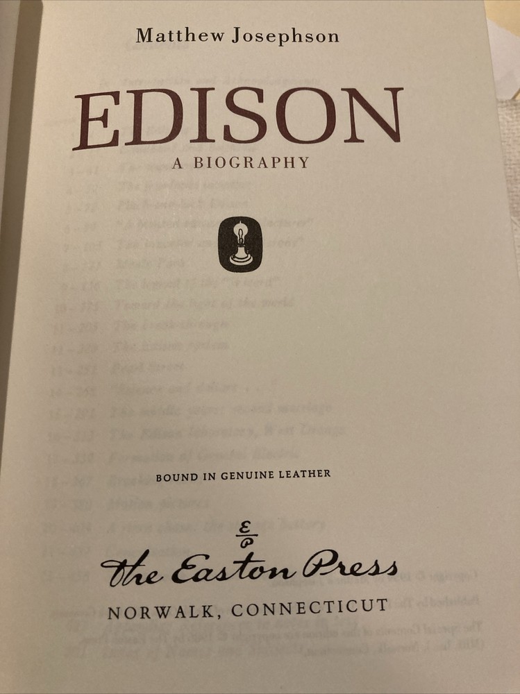 Easton Press leather edition of Matthew Josephson's "Edison: A Biography," one of the LIBRARY OF GREAT LIVES series, Illustrated with Period Photographs, published in 1986. Bound in brown leather, the book has decorative paper end leaves, a satin book marker, acid-free paper, Symth-sewn binding, hubbed spine, gold gilding on three edges---in near FINE condition. COLLECTOR'S NOTES is included. Thomas Alva Edison , who lived from 1847 – 1929, was an American industrialist, business magnate, who was unschooled and self-taught. Born in Ohio, Edison was raised in Michigan and was fascinated in the mechanical age. It was an eclectic education, but by his early twenties, he knew as much about telegraphy and almost as much about electricity as anyone alive. Edison married Mary Stilwell in 1871 when she was 16 years old and they became parents to three children. The Edisons lived in a comfortable house and there was a staff of two Negro servants and a coachman, but Mary saw little of her husband and she was often left alone with her children. Edison had no hobbies nor recreations. When she died in 1884, Edison later courted and married Mina Miller, daughter of an Akron philanthropist. The unpolished Edition could be most charming and attentive to women and now that he was a rich man, he showered his second wife with expensive gifts. They bought a $200,000 house in suburban West Orange, New Jersey and they built a winter home in Fort Meyers, Florida. Mina set about "refining" her husband. Edison was a rough-hewn, old-fashioned American individualist. The couple became parents to three children: daughter, Madeline, and sons, Charles and Theodore. Before he was thirty, he had invented and sold stock market ticker tape machines, greatly improved telegraph and telephone systems and was already established in his own research laboratory. In 1877, Edison set out to electrify the world. He foresaw large electrical distribution networks and everyday use of incandescent electric light bulbs, both of which he proposed to invent. Later in life, Edison became best friends with HENRY FORD. When Edison died in 1929, the President of the U.S. suggested that everyone dim their lights at 10:00 P.M., the night of the funeral, in silent tribute to the man whom Sarah Bernhardt had called "The Giver of Light." 511 pages, including an Index. I offer Combined shipping.