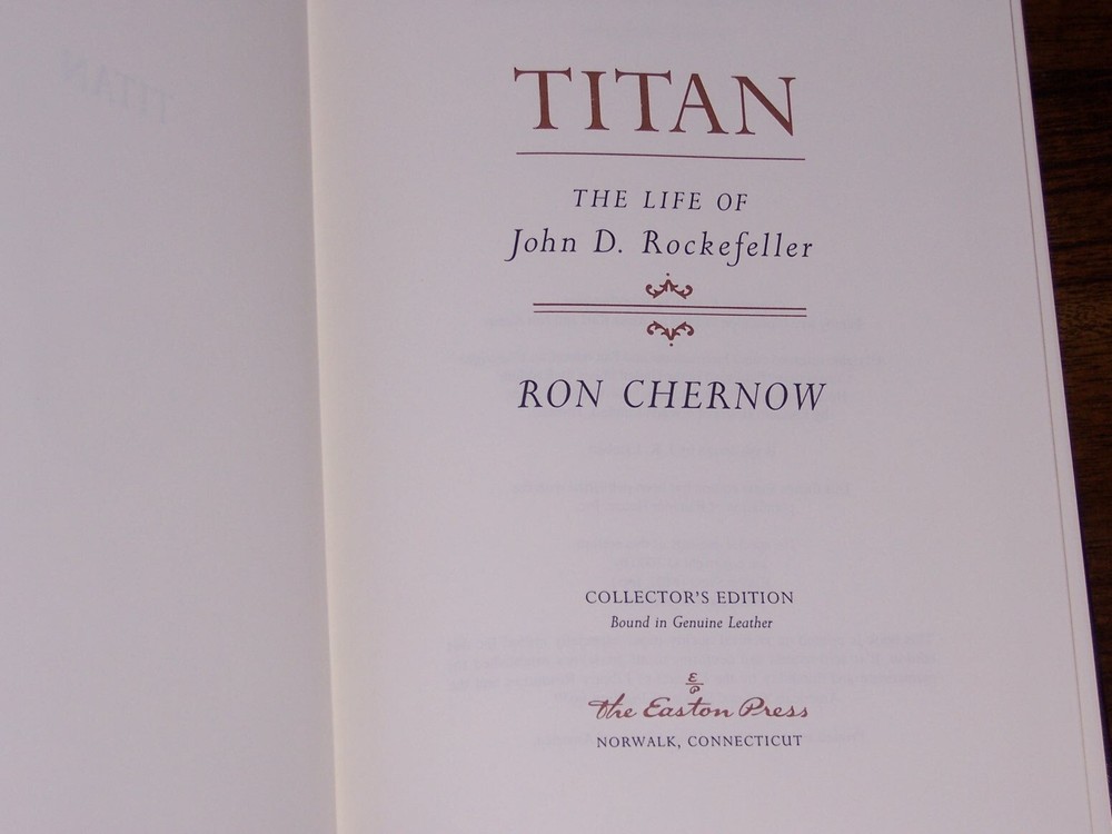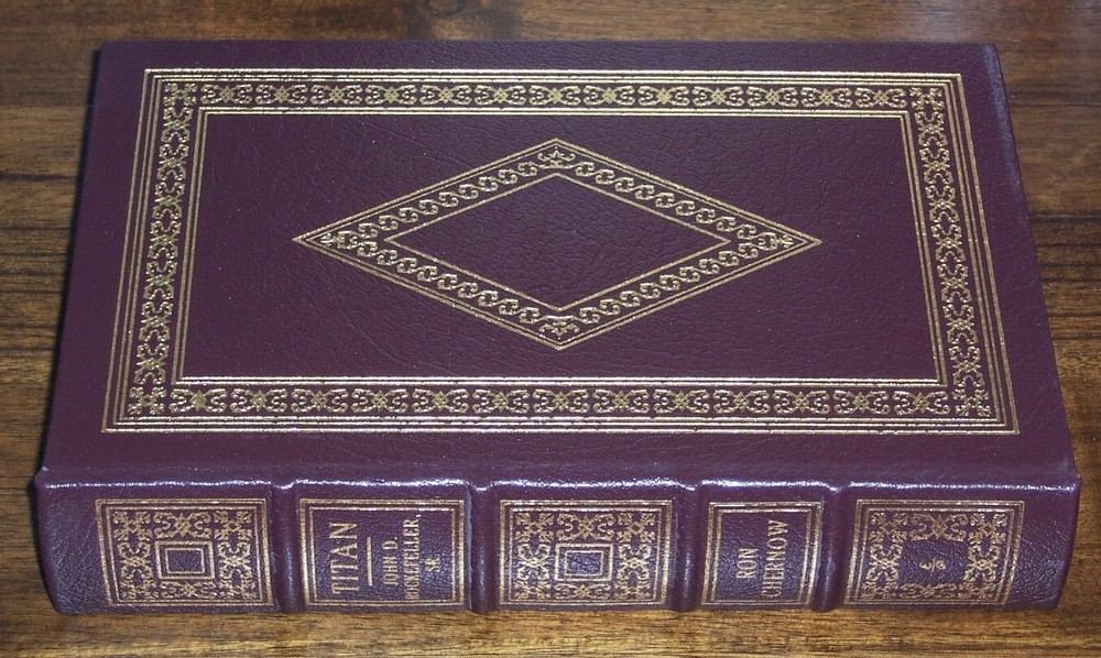 Heirloom Edition Easton Press TITAN Life of John D. Rockefeller by Ron Chernow Brown leather binding with stamped design on the front measured by 6 1/4" x 9 1/2" do not miss this great deal Copyright by The Easton Press hubbed spine, bound in premium full leathers distinctive cover design, beautiful illustrations handsome, readable typefaces, permanent satin ribbon page marker elegant gilded page edges, endsheets of rich moire fabric thread-sewn pages for durability and strength, long-lasting high quality, acid-neutral paper CONDITION DESCRIPTION: Like new and unread condition, shiny gold page edging, beautiful bright endleaves, and satin ribbon page marker. It is a very special books to be added to your personal collection. SHIPPING / HANDLING: Book(s) will be handled/packed very safely, and shipped via USPS media mail with delivery confirmation.