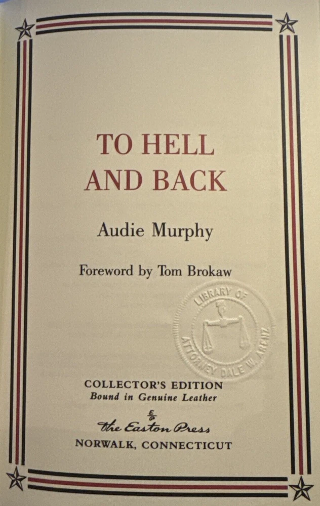 My wife is making me thin down my collection so I will be listing many great books in the next few months. To Hell and Back Audie Murphy Collector’s Edition bound in Genuine Leather w/ Salmon Ribbon Marker (Easton Press) Brown Leather Cover Gold Title / Page ends are gilded in 22-karat gold Pages 274 Books will be packed to arrive as they left. Will Combine Shipping Check out my other items ! Be sure to add me to your favorites list ! Genuine full colored leather with 22KT gold design on hubbed spine, front & back covers. Gilt gold page edges. Lustrous moire silk end pages. Satin ribbon page marker. Thread sewn pages for durability and strength. Printe d on aci d neutra l archival paper. Condition: Excellent Condition. Has glue residue on FFEP from removed bookplate. Has former owners embossed seal on title page. There is very minor scratching of gold gilt on page edges. See pics. The book was never read so the condition is AS N EW, very slight marks to gilt page edges . Binding is tight and clean. No writing, creases or markings, unbumped corners. The Easton Press books feature some of the most renowned works of literature in the most beautiful leather-bound editions which will be the cornerstone of your home library or the perfect gift for any book collector.