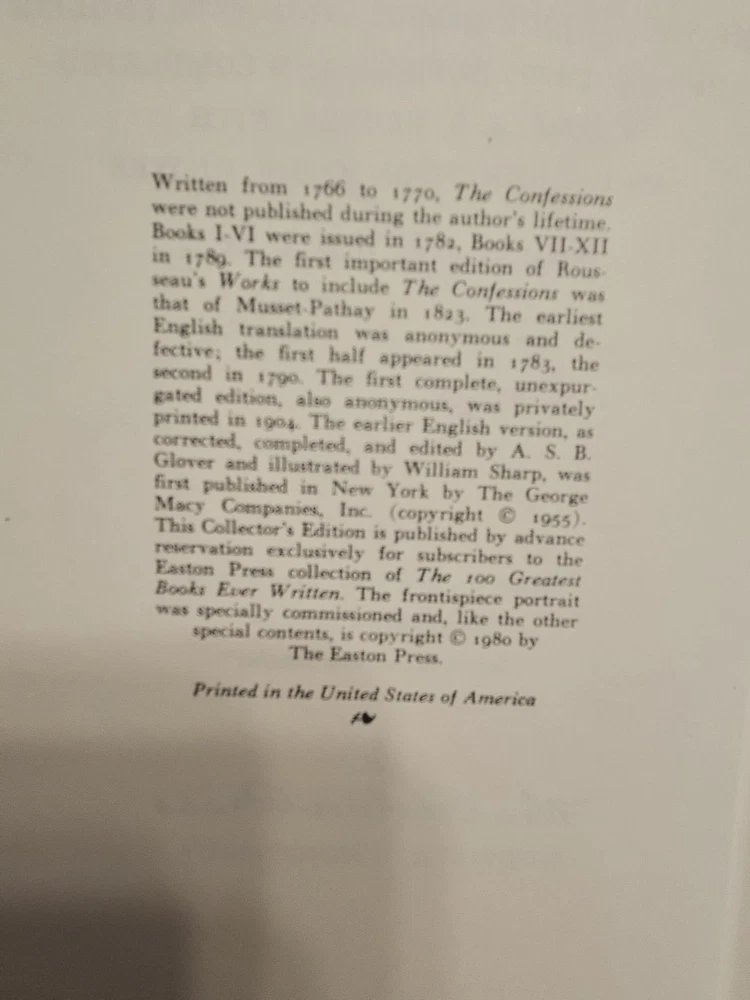 Delve into the stirring writings of Jean-Jacques Rousseau with this exquisite 1980 collector's edition of "The Confessions" from Easton Press. Bound in rich leather and illustrated by the talented William Sharp, this volume is a testament to the classics of biography and autobiography. It's a treasure for both collectors and philosophy enthusiasts, offering a glimpse into the vivid narrative of Rousseau's life and thoughts. Published in Norwalk, Connecticut, this English-language edition stands out with its special collector's edition attributes and the timeless subject of classics. It's a singular unit that has been meticulously crafted in the United States, preserving the authenticity of the original print from 1980. A must-have addition to any scholarly library, this book is a celebration of literary artistry and intellectual history. Easton Press leather-bound collectors edition of "The confessions of Jean-Jacques Rousseau". Book pages are pristine and appear unread. Binding is intact but has minor color imperfections from being on shelf. I tried to capture in pictures. Great condition book overall.