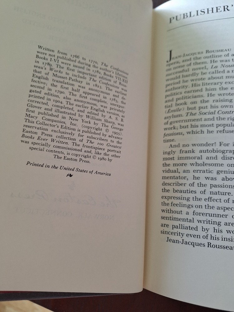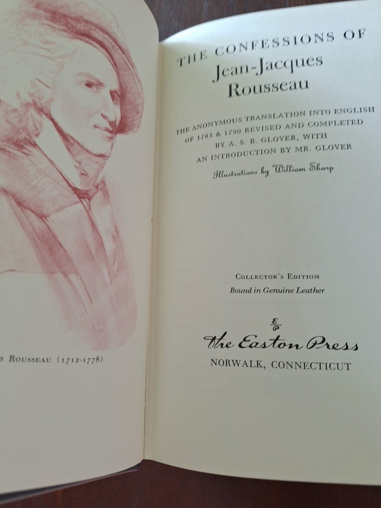Delve into the stirring narrative of "The Confessions of Jean-Jacques Rousseau," presented in a luxurious 1980 Collector's Edition by Easton Press. This timeless piece of literature, bound in elegant leather, offers not only a captivating read but also a collectible treasure for enthusiasts of classics. The book is richly illustrated by William Sharp, adding a layer of visual allure to the profound writings within. Some minor wear to guilding mostly some scratches on top guilding.