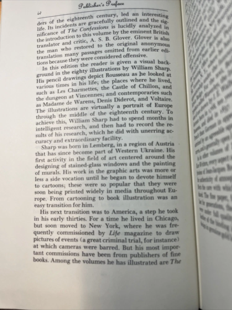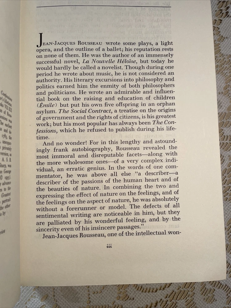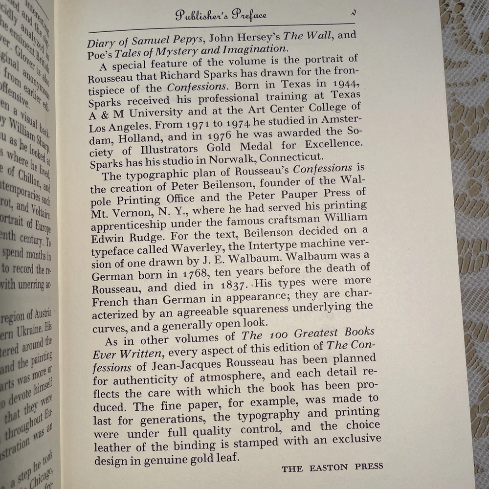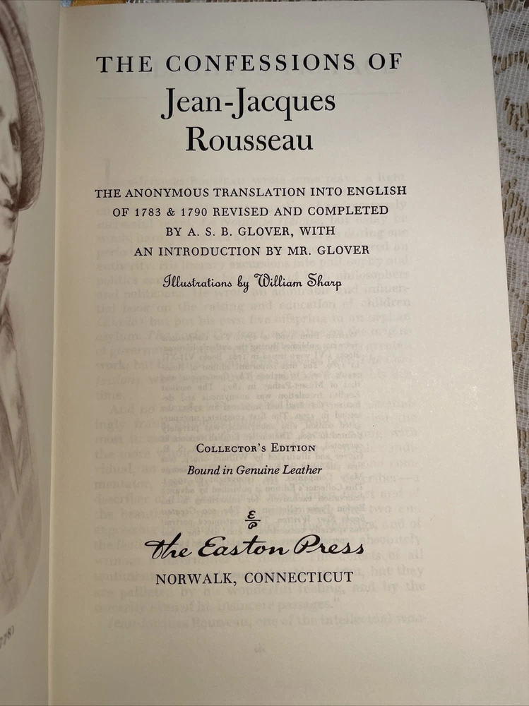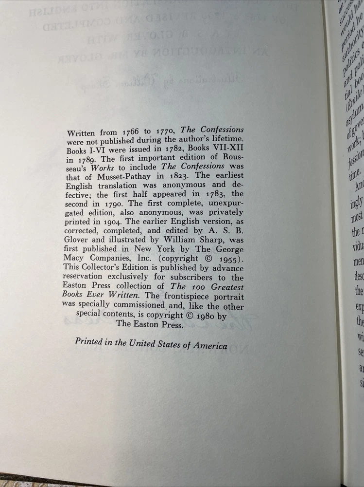 Easton Press - The Confessions of Jean-Jacques Rousseau 100 Greatest Books. LIKE NEW! Except hard to see scratch in beautiful gild. PAGE PERFECT! Binding is very tight book has never been fully opened seems to be unread. This pitiful at copy seems rare as I didn’t see any with this cover when searching eBay.