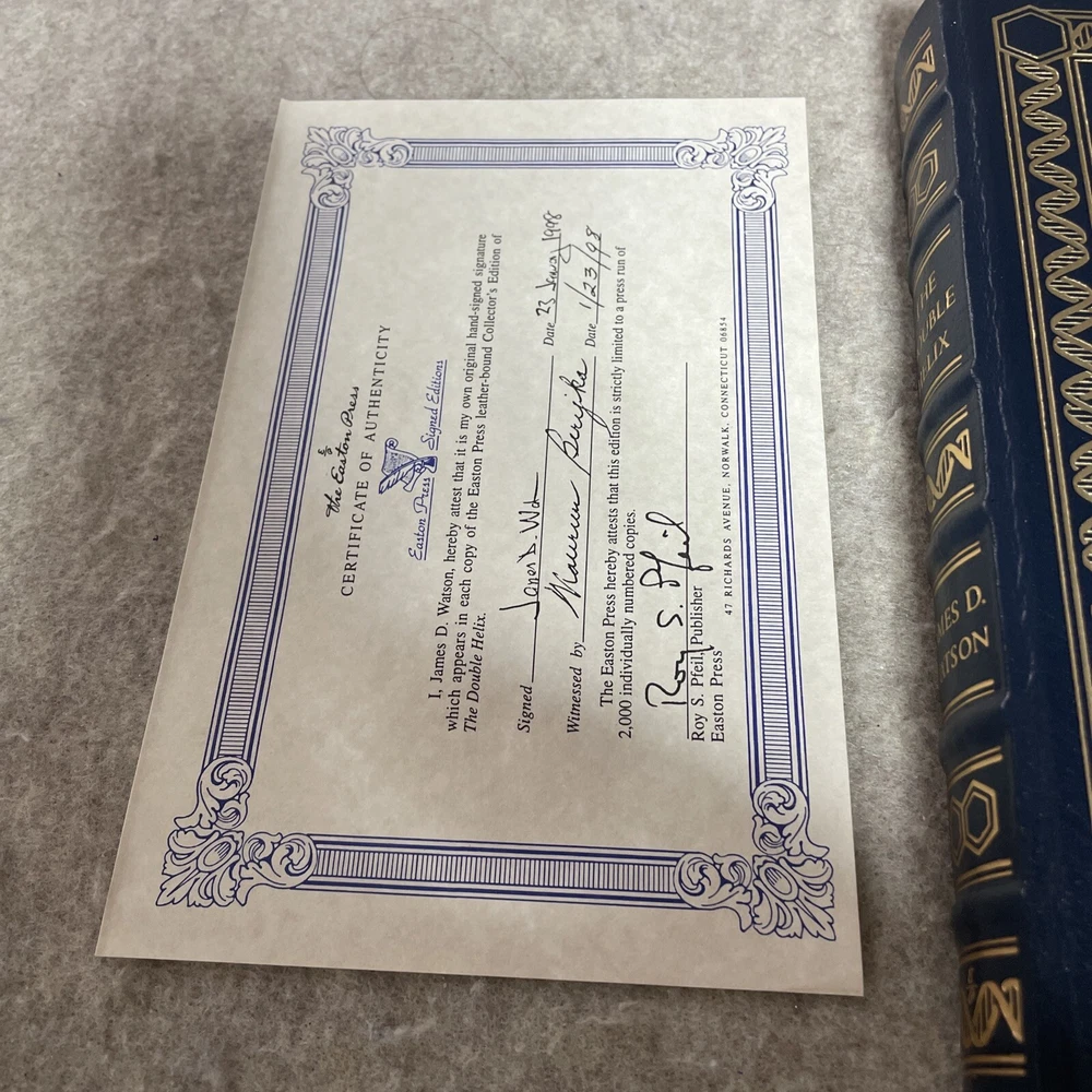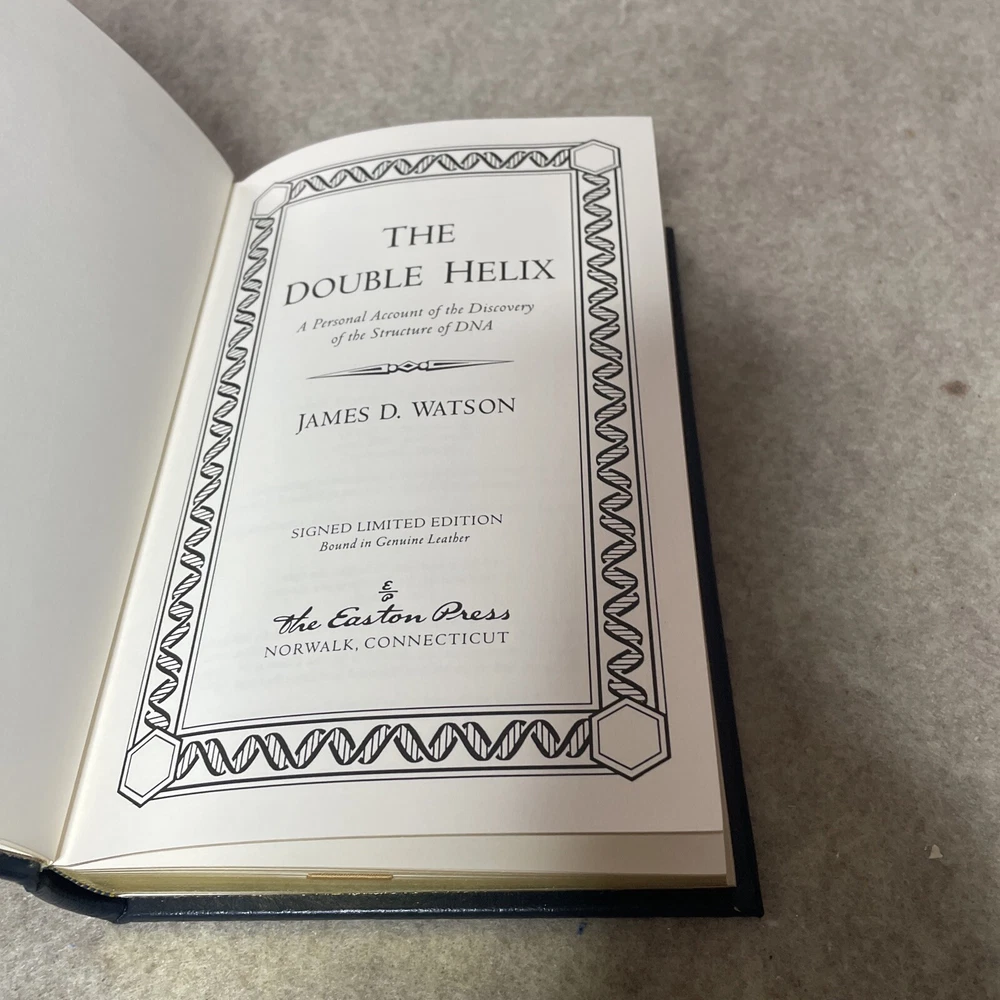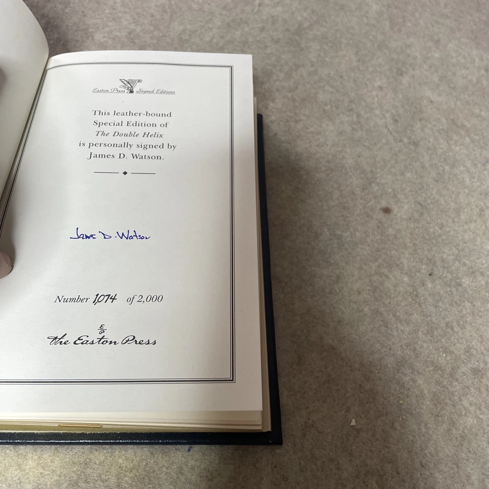 Easton Press Signed First Edition The Double Helix by James D. Watson The book is full leather. It is signed by the author. This book is in near mint condition with a light bump to one corner The gold on the covers looks like new. The end pages show no fading. The gilt on the edge of the pages is in very good condition with a scratch on the side and bottom and spots of loss on the top. Please see photos. We try to describe as accurately as possible so you will be satisfied with your purchase. We have more books from this set on eBay and we would be happy to combine on shipping to save you money. All books are sent with insurance via USPS Media Mail.