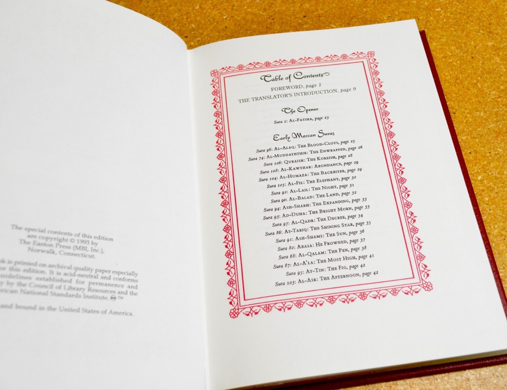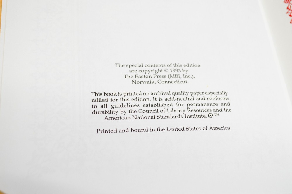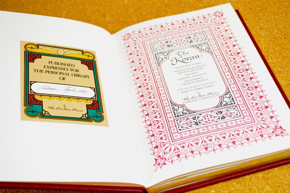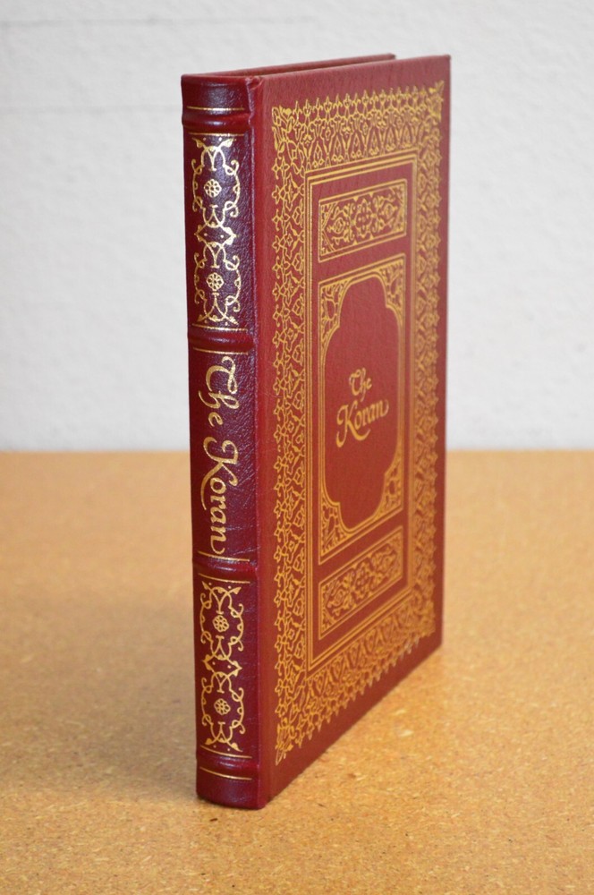 The Koran: Selected Suras translated from the Arabic by Arthur Jeffery Forward by Gerhard Bowering and decorated by Valenti Angelo Collector's Edition from the original Easton Press Books That Changed the World Series bound in sumptuous red leather published by Easton Press 1993 A beautiful book in virtually mint condition. Blemish-free leather, tight spine, excellent gilt, ribbon in original placement, seemingly unread. Previous owner's bookplate attached on copyright page. See photos. ~~~~~~~~~~~~~~~~~~~~~~~~ Easton Press is recognized as the highest quality modern leather books available, and will make a stunning addition to your library or a fitting start to a fine binding leather book collection. Each book is bound in a signature color and design, and exhibits 22 karat gold foil stamping of the titles and jacket designs. They are printed on archival quality acid-neutral paper and include silk moire endpapers, an expensive hubbed spine, bound-in silk ribbons bookmarks, gilded page edges, Smyth-sewn pages for strength and durability and often contain beautiful illustrations. ~~~~~~~~~~~~~~~~The Fine Print~~~~~~~~~~~~~~~~: At Rarified Books, we take pride in offering items of extraordinary quality, value and condition. We offer the finest in modern leather-bound books and more. Books are sourced from smoke free homes, and are carefully inspected. Other items are equally carefully sourced ... check out our other listings and see! All descriptions are to the best of our knowledge. Sales are made as-is and no warranty is offered as to authenticity or provenance. Title passes to the buyer upon shipment. All sales are final. Sales tax may apply which is collected automatically by eBay. Returns are not accepted except in rare circumstances upon agreement. Shipping is the responsibility of the buyer unless otherwise noted or agreed. Books are wrapped and protected in bubble wrapping for shipping, with additional cushioning paper filler in an appropriately sized carton or padded envelope. Most books will be shipped via USPS Media Mail with tracking or FedEx Home Delivery. International Shipping through eBay's Global Shipping Program only. International buyers are responsible for all local customs fees, taxes, and duties. These charges are not included in our shipping costs. We also buy books and are always open to purchasing excellent condition books from Easton Press, Franklin Library, Folio Society and similar as well as other rare and collectible books. See our website www.modernleatherbooks.com and let us know what you have. Thank you for considering our listing!
