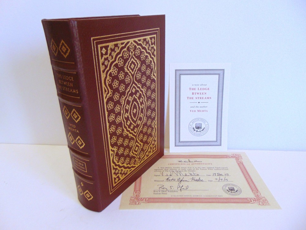Easton Press The Ledge Between the Streams (Signed Edition) By Ved Mehta This Easton Press book is in very good, used condition. There is minor shelf wear and a scratch to the front page end gold gilding (common for these books when the original owner isn't careful opening the publisher's shrink wrap). The collector's note sheet and signature certificate of authenticity are included. There is a filled-in bookplate inside the front cover. The book will be carefully packaged for shipping. Please ask any questions prior to bidding. If you win multiple items, please wait for an invoice before paying otherwise we may not be able to combine shipping costs. (We will do our best to combine shipping however we will not hold items for an extended period of time.) NO international shipping. NO freight forwarding addresses. US orders only!