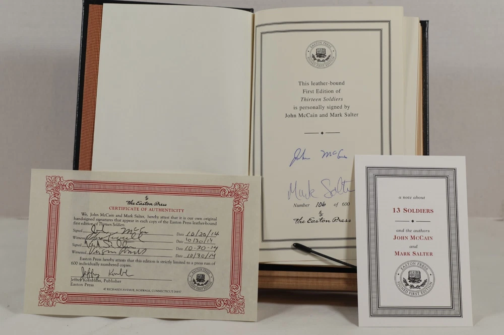 You are looking at Thirteen Soldiers by John McCain This is a Signed First Edition. The condition of the book is "Like NEW". Please ask questions before buying it. Take a look at my other Easton Press books. I'll combine shipping. Check my feedback and bid with confidence. SHIPPING We highly recommend selecting UPS Shipping. In case you select USPS Media Mail please be prepared for the delivery time that can take between 7 to 21 days inside of the continental 48 states. PAYMENT POLICY If you have feedback of less than 5, please contact me before buying.