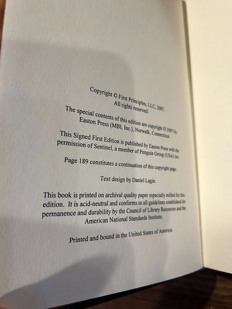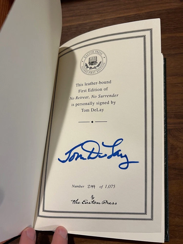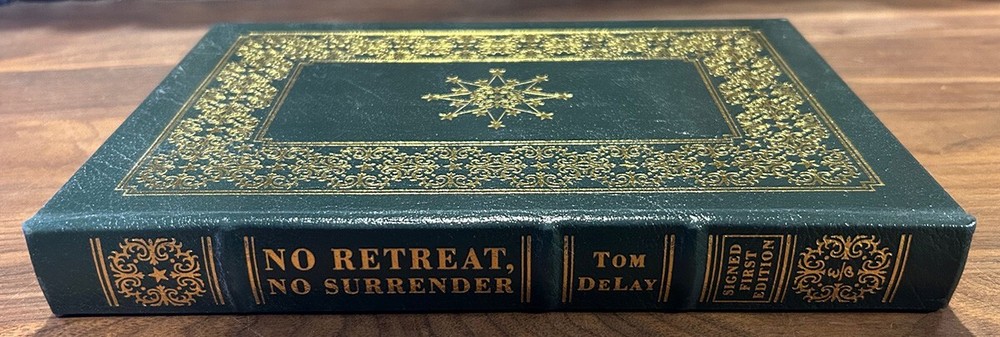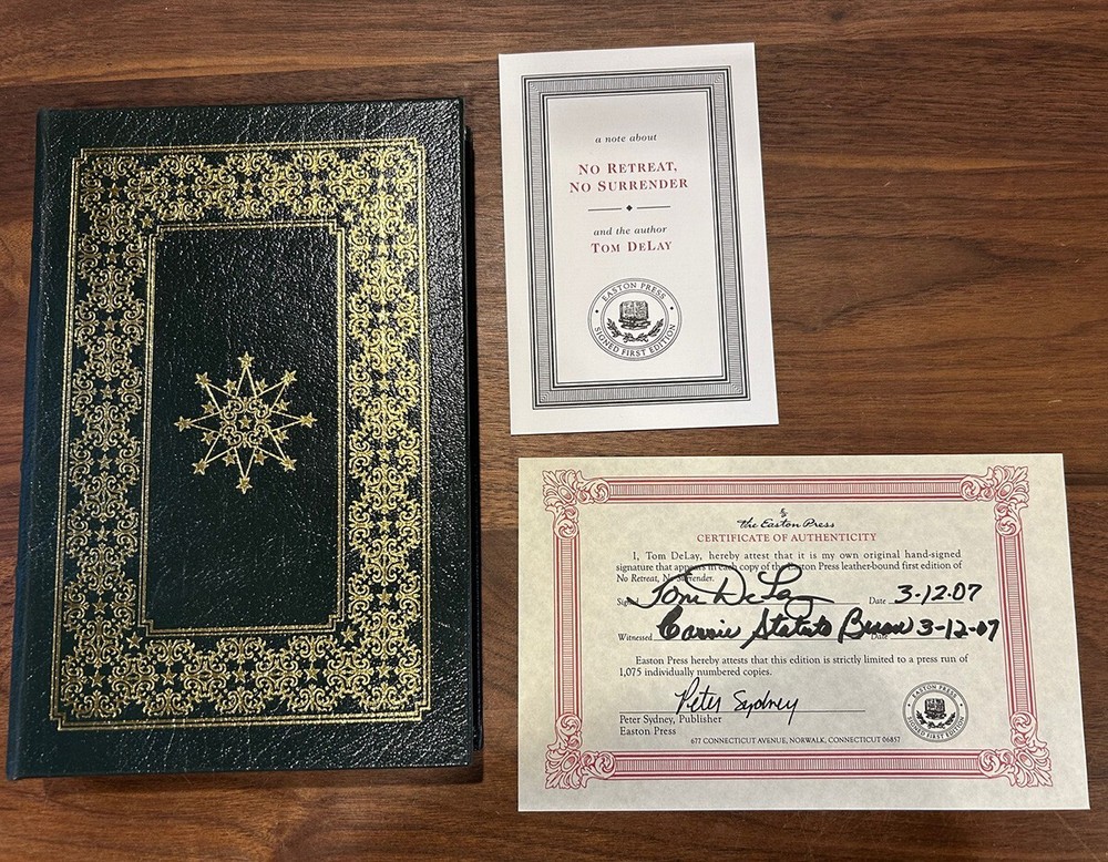 TOM DELAY - No Retreat, No Surrender - Signed 1st Edition / Easton Press 1st Printing Hardcover Norwalk, Connecticut Easton Press, Leather Bound Limited Edition Signed by Author. Includes COA and Notes Book accented in 22kt gold. Printed on archival paper with gilded edges. The endsheets are of moire fabric with a silk ribbon page marker. Smyth sewing and concealed muslin joints to ensure the highest quality binding. This book is in full leather with hubbed spines. Tom DeLay No Retreat, No Surrender Signed First Edition Bound in Genuine Leather The Easton Press 2007 Number 299 of 1,075 Includes Certificate of Authenticity and Author Note