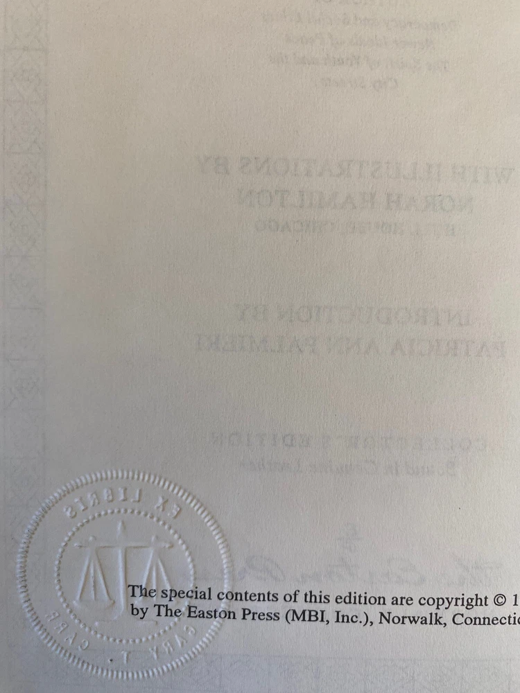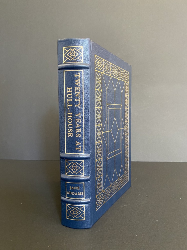 Twenty Years at Hull-House with Autobiographical Notes. Jane Addams. Easton Press. Norwalk, 1991. Leather, 462 pp. Bookplate cleanly removed from front free endpaper, with a light shadow remaining. Slight fade to endpapers. Slight wear to edges of the boards. Blindstamp to title page. A Good to Very Good copy.