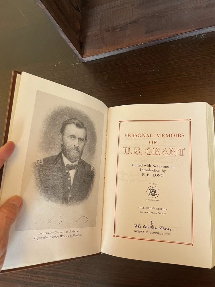 Offering this handsome deluxe leather fine binding edition of Personal Memoirs of U S Grant , edited with notes and an introduction by E B Long. Easton Press, 1989. Collector's Edition, The Library of the Presidents. Full leather hardcover decorated with 22k gold, and gold page edges, and attached ribbon page marker. Collector's Notes included. Faint foxing top page edge gilt. Else clean and unmarked with light wear. Nice copy!
