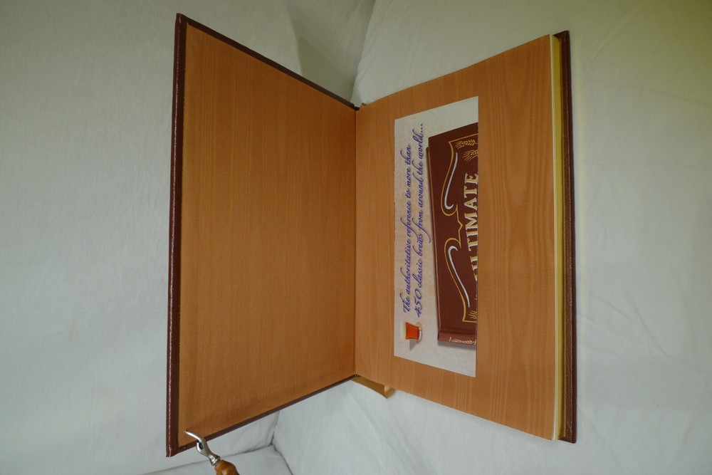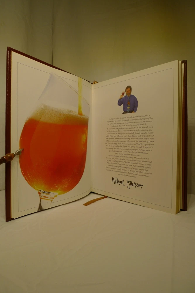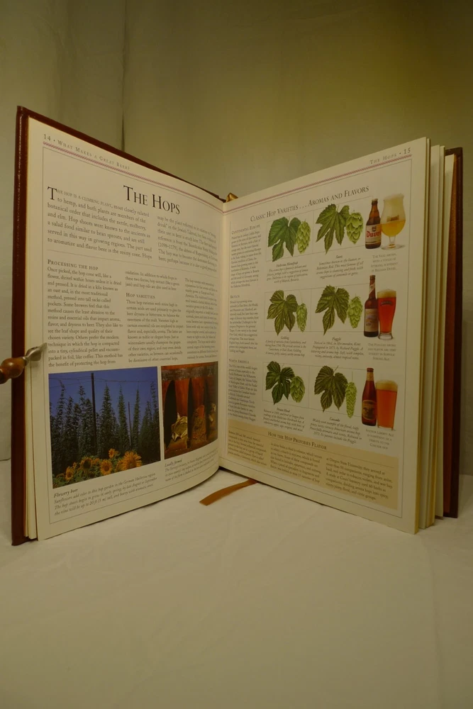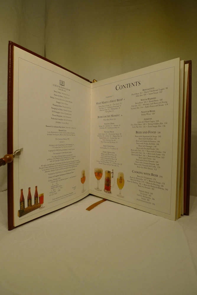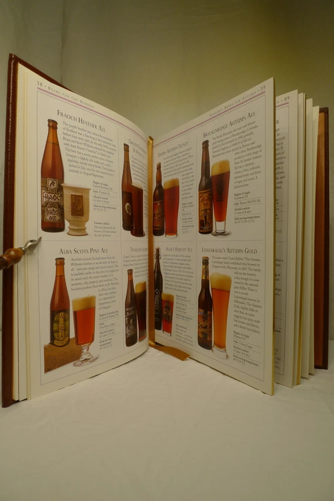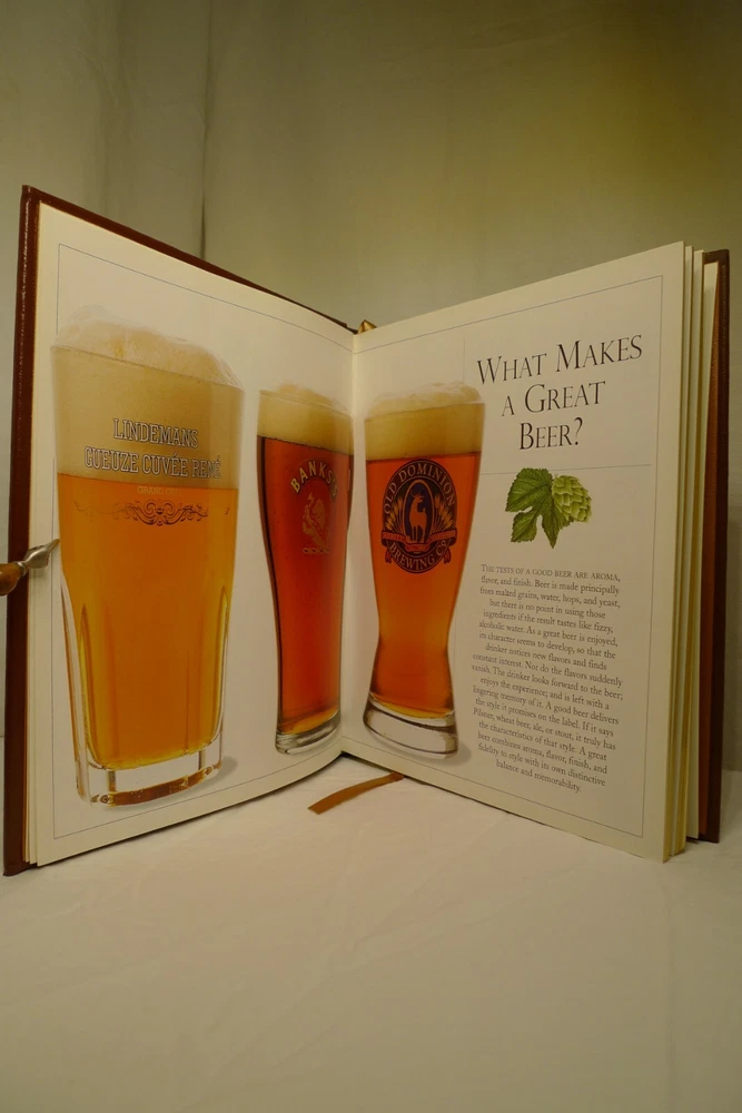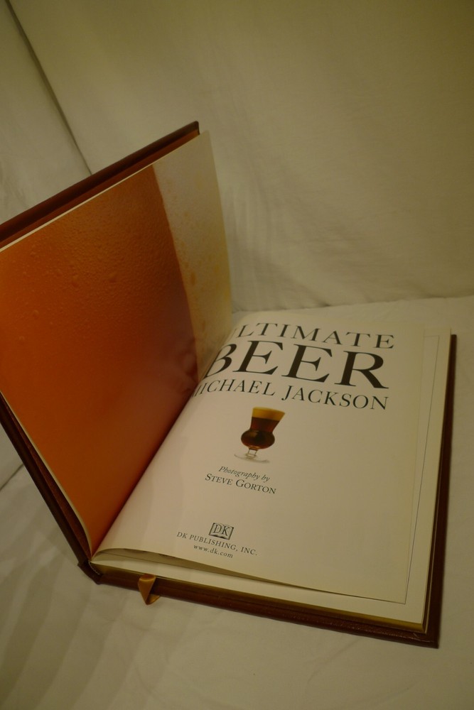 Title: Ultimate Beer. Author: Michael Jackson. Illustrator: Steve Gorton (Photography). Publisher: Easton Press / DK Publishing. Publication date: 1998. Edition: First American Edition, 6th printing. Origin: New York, NY, USA. Description: 192 p. 4to. Illustrated quarto in full color, bound in fine genuine brown leather with 22 karat gold decorations. All page edges gilded with 22 karat gold, raised spine hubs, sewn-in satin ribbon bookmarks, archival quality paper, silk moire fabric endpapers and sewn pages for strength and durability. Measures: 11 H x 9.25 D x 1 W inches. Approximate Weight: 3 pounds, 2 ounces. Includes: 1 book, publisher's promotional ephemera about the work. About the work: The authoritative reference to more than 450 classic brews from around the world...