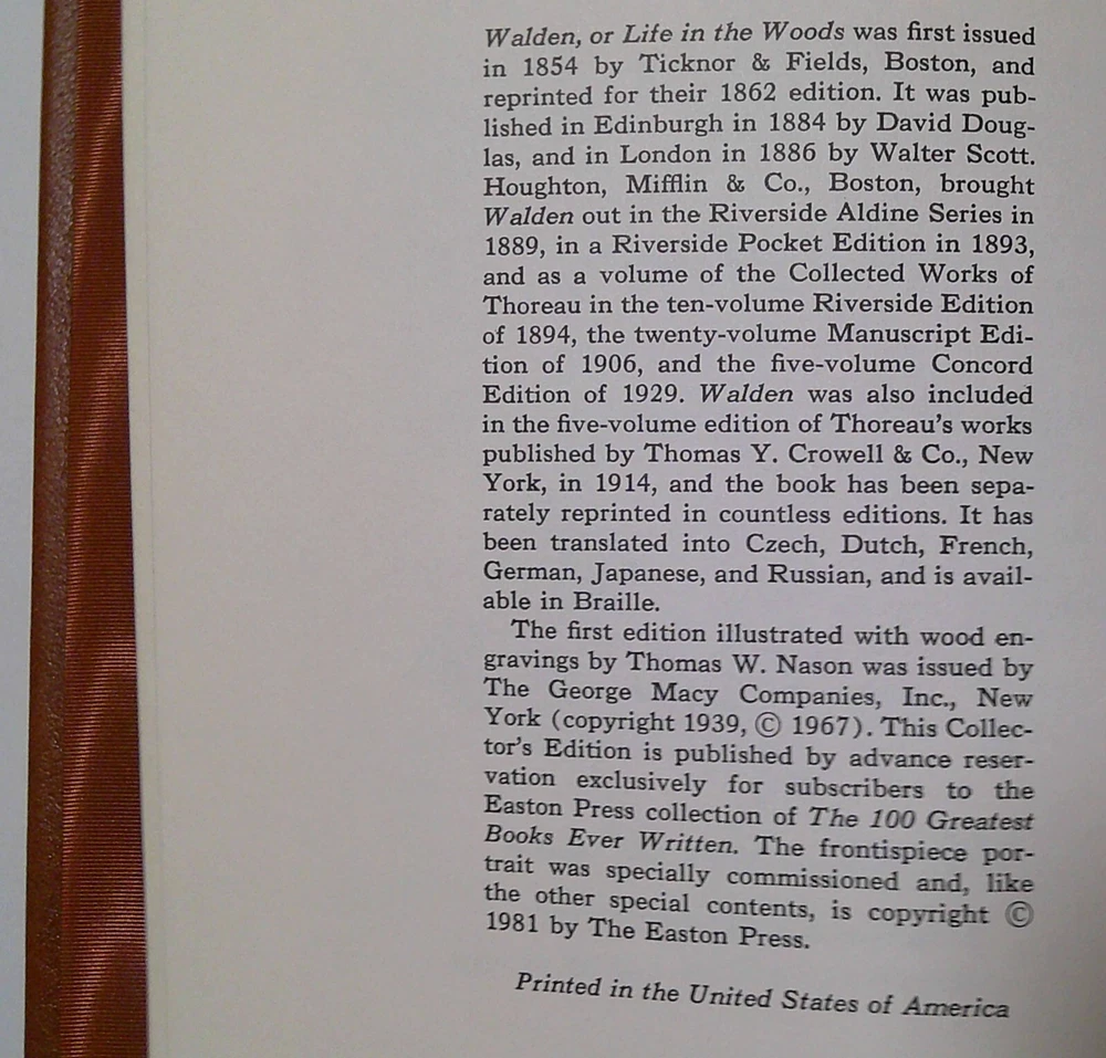 The Easton Press Collector’s Edition WALDEN by Henry David Thoreau Beautifully Illustrated with Wood Engravings by Thomas W. Nason Illustrated with a Frontispiece of Henry David Thoreau (1817-1862) and Other Illustrations Published in 1981 by The Easton Press of Norwalk, Connecticut as One of The Easton Press Collection of The 100 Greatest Books Ever Written 1980 Easton PRESS LIMITED COLLECTOR’S EDITION BOUND IN GENUINE LEATHER COVERS 5.625 X 8.325 Inches - 335 Numbered Pages Excellent Condition! Up for sale is a beautiful luxury edition of The Easton Press 1981 Limited Edition leather-bound book titled: WALDEN by Henry David Thoreau! This book is beautifully illustrated in color by Thomas W. Nason. This is an advanced reserved edition published exclusively for subscribers to the Easton Press collection of The 100 Greatest Books Ever Written. This luxury book features spine hubs, the page edges are protected with a decorative gilt coating, complemented by a silk ribbon marker and moiré endleaves. CONDITION: This book is 44 years old. It is in excellent condition as evidenced from the photos. The covers are in excellent condition, both leather covers are beautifully decorated with gold gilt. The inside covers are in excellent condition. The pages are in excellent condition, very nice. The ribbed spine is in excellent condition. There is an Easton Press bookplate with the original owners‘ name neatly written on it, affixed to the second front endpaper. There are no other markings or writing anywhere in this book. This book comes from a smoke free home. This is a very nice book that will make for a nice addition to your library. This book would make a great gift for someone special! Save money on shipping by purchasing multiple books! See Photos. Please E-mail with any inquires. Payment can be made by any method accepted by eBay. I will securely package this book IN A SPECIAL BOX so that no damage occurs during shipping. I will ship immediately upon receiving your payment. Tracking information will be automatically uploaded as soon as the item has been shipped. International purchases are welcomed and International buyer's cost is determined by eBay's International Shipping Program. Thanks for looking! Visit my other Listings in my eBay Store!