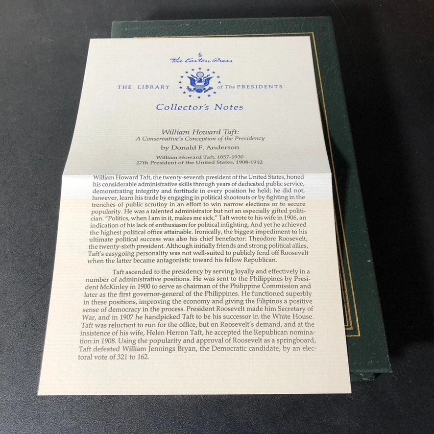 Very nice condition. May have signs of use/storage. Please see photos. This Easton Press collector's edition book on President William Howard Taft by Donald F. Anderson is a must-have for any library. The leather binding and original copy make it a unique addition to any collection. The book covers the topic of presidential history and biography & autobiography, making it a great resource for anyone interested in the subject. The publisher, Easton Press, is known for its high-quality books and this one is no exception. The author, Donald F. Anderson, is an expert on President Taft and this book is a great representation of his research. The book is in English and was published in the U.S.