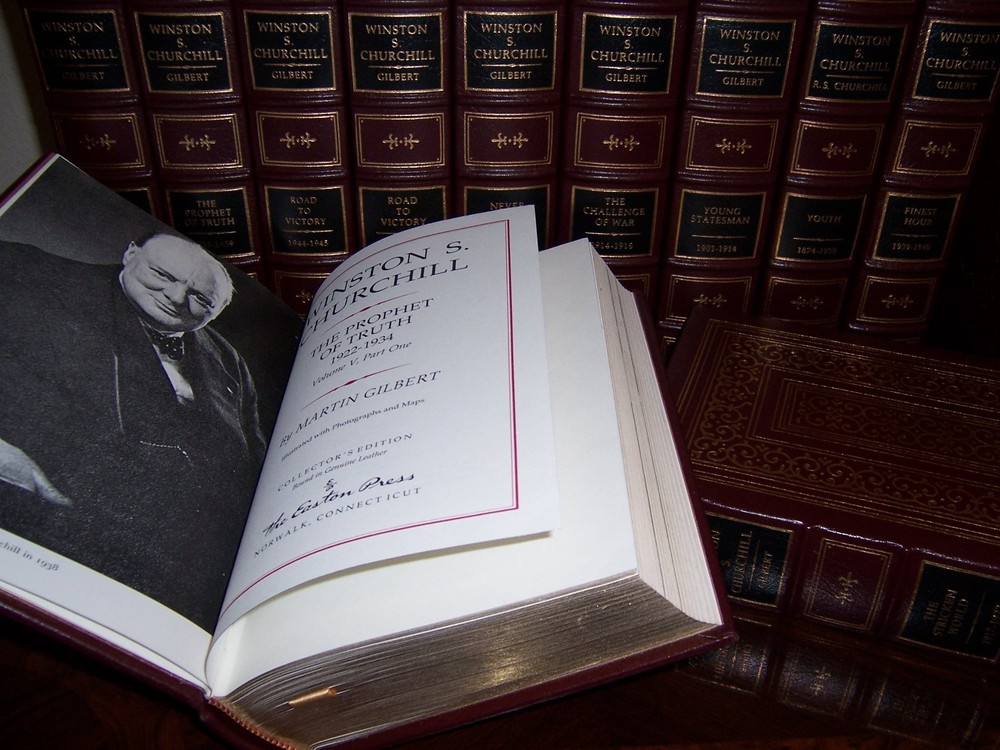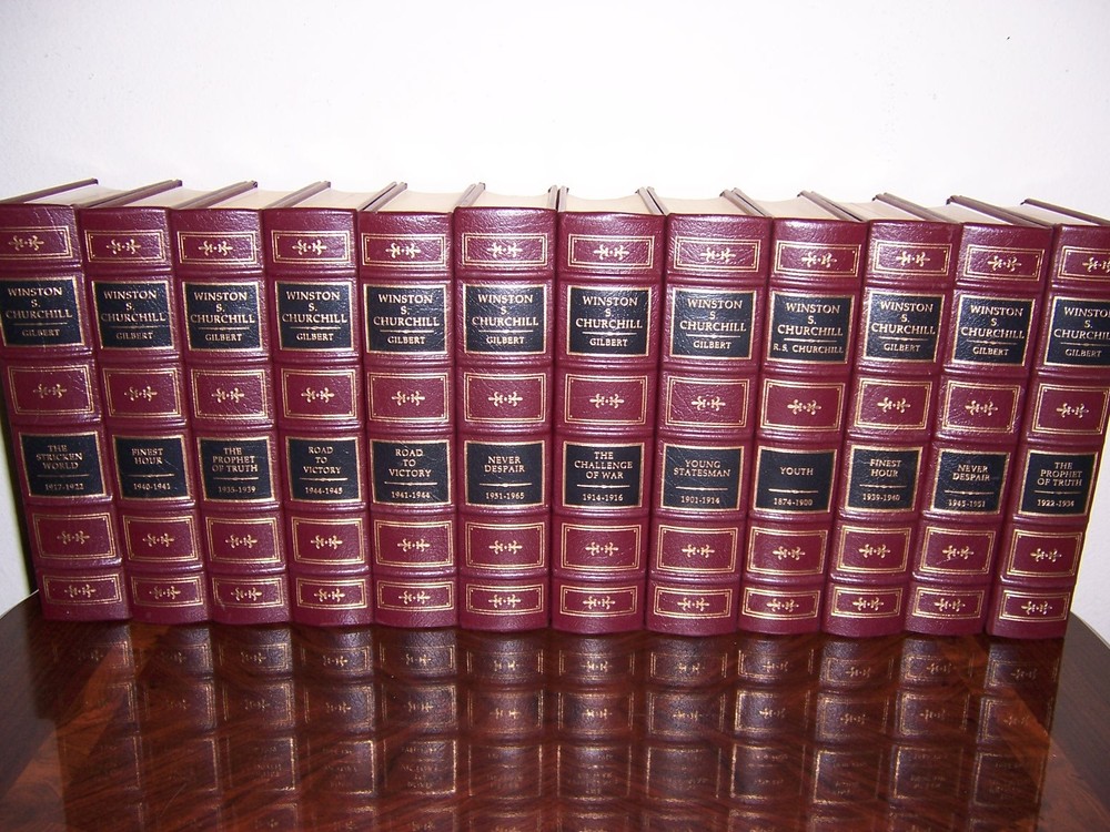 The most comprehensive biography of Churchill Easton Press WINSTON S CHURCHILL in 12 volumes by Randolph S Churchill and Martin Gilbert Full maroon leather with gilt ornamentation profusely illustrated with reproductions from historical photographs out-of-print, do not miss out this good deal Copyright by The Easton Press hubbed spine, bound in premium full leathers distinctive cover design, beautiful illustrations handsome, readable typefaces, permanent satin ribbon page marker elegant gilded page edges, endsheets of rich moire fabric thread-sewn pages for durability and strength, long-lasting high quality, acid-neutral paper LIST OF TITLES: a complete 12-vol set: Vol I : YOUTH 1874-1900 Vol II : YOUNG STATEMAN 1901-1914 Vol III: THE CHALLENGE OF WAR 1914-1916 Vol IV : THE STRICKEN WORLD 1917-1922 Vol V, Part one : THE PROPHET OF TRUTH 1922-1934 Vol V, Part two : THE PROPHET OF TRUTH 1935-1939 Vol VI, Part one : FINEST HOUR 1939-1940 Vol VI, Part two : FINEST HOUR 1940-1941 Vol VII, Part one : ROAD TO VICTORY 1941-1944 Vol VII, Part two : ROAD TO VICTORY 1944-1945 Vol VIII, Part one : NEVER DESPAIR 1945-1951 Vol VIII, Part two : NEVER DESPAIR 1951-1965 CONDITION DESCRIPTION: Like new and unread condition, blank unattached bookplates with distinct design, clean inside, solid hardcover, exquisitely bound in genuine leather. This set could be a precious addition to your family library. SHIPPING / HANDLING: Book(s) will be handled/packed very safely, and shipped via USPS media mail with delivery confirmation.