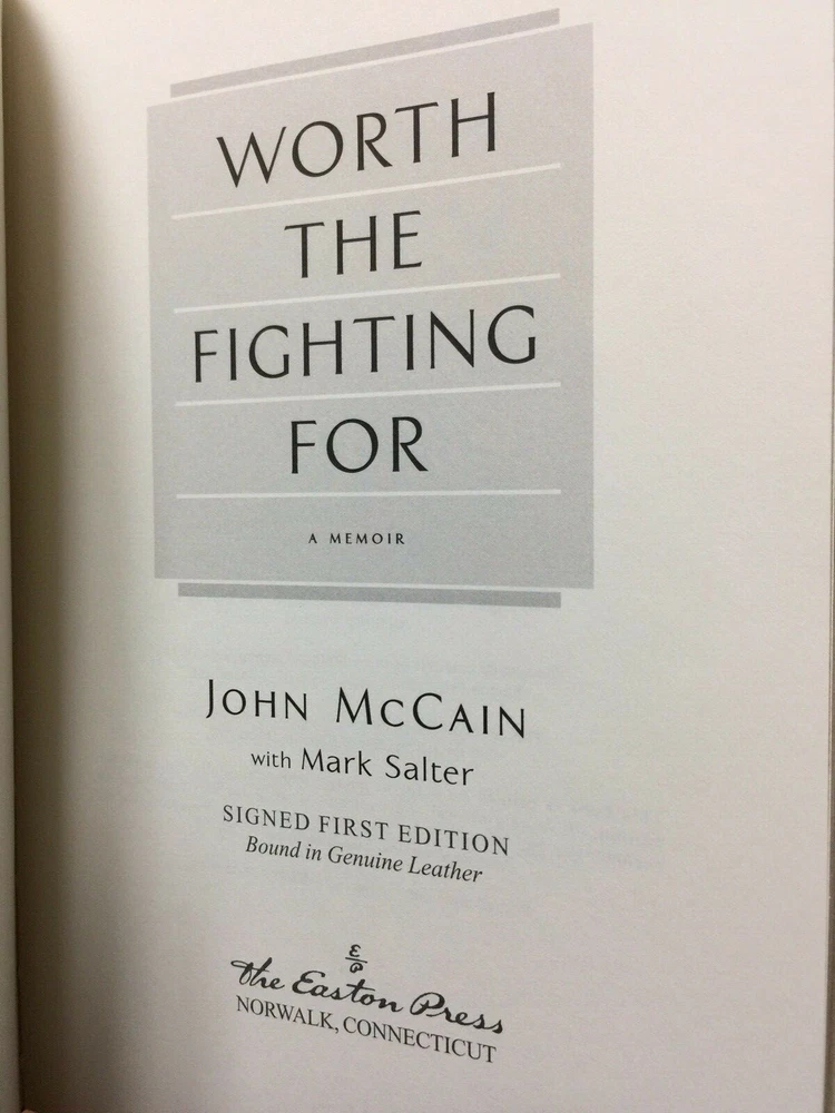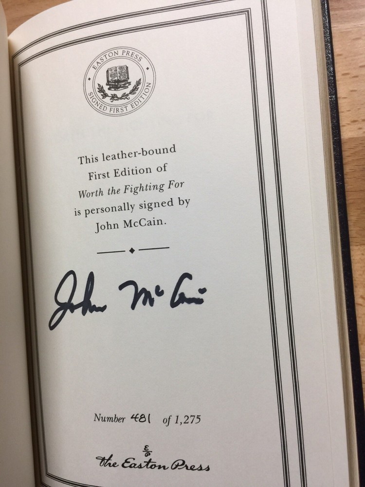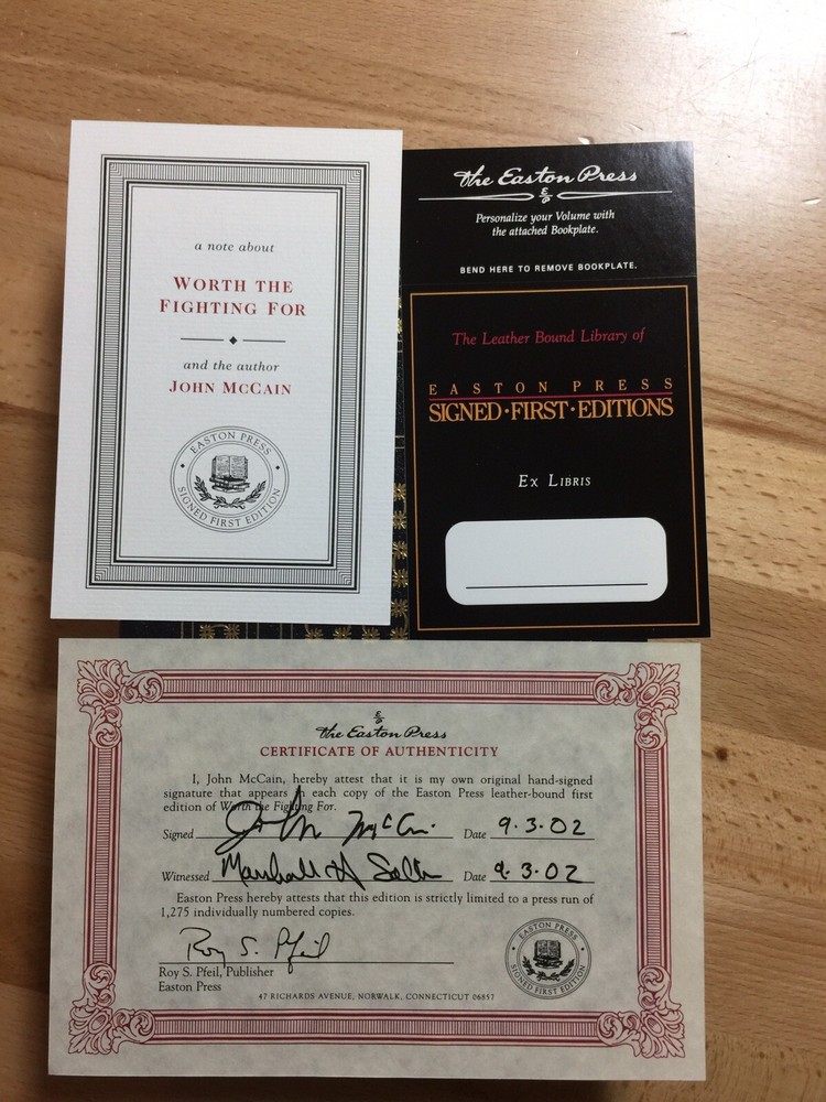 Easton Press books generally have distinctive features such as a genuine, premium leather binding, 22kt gold cover and spine lettering and decoration, specially milled acid-neutral paper, Smyth-sewn pages with gilded edges, and endsheets of moiré silk with a permanent satin ribbon page-marker. Wonderful for the collector. Great gift! Comes with information about John McCain and a signed certificate of Authenticity. This book is the 481th signed of 1,275. See Photos.