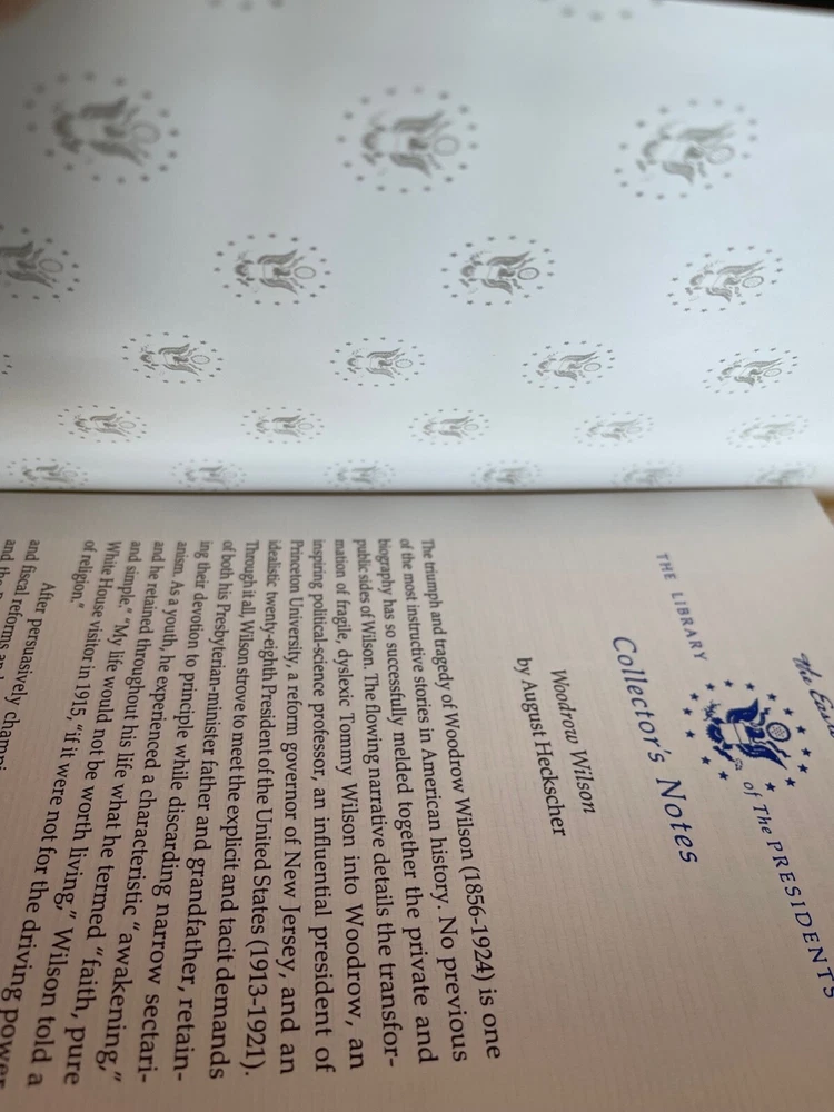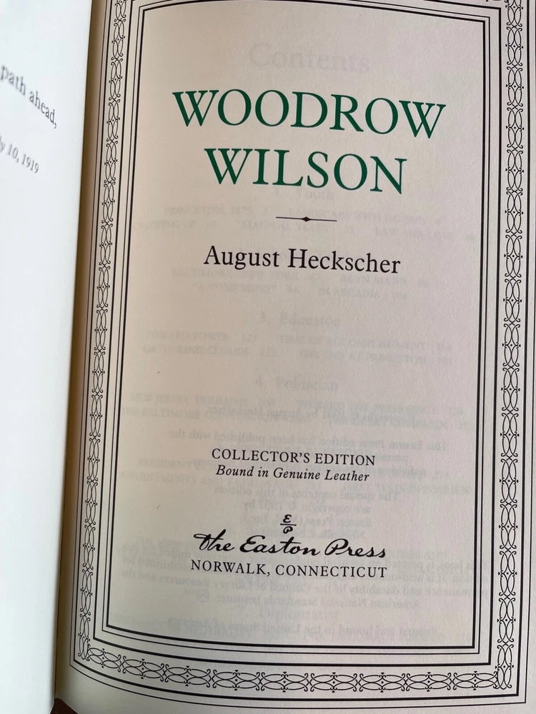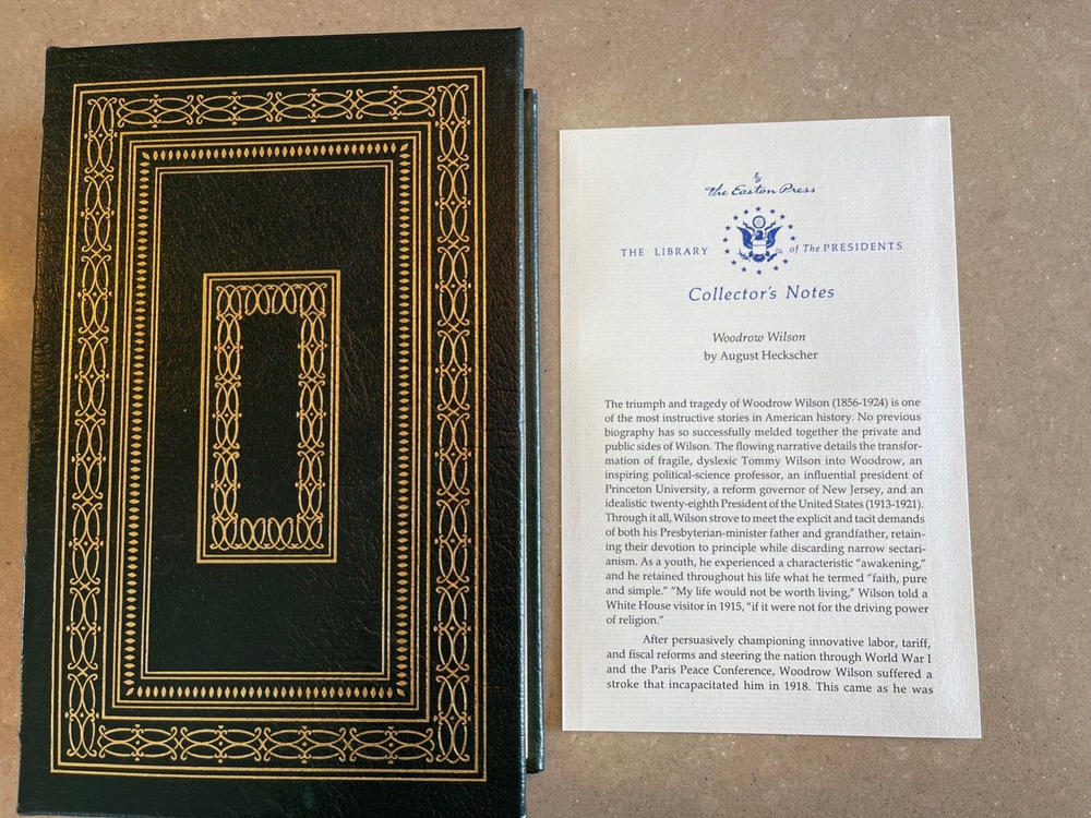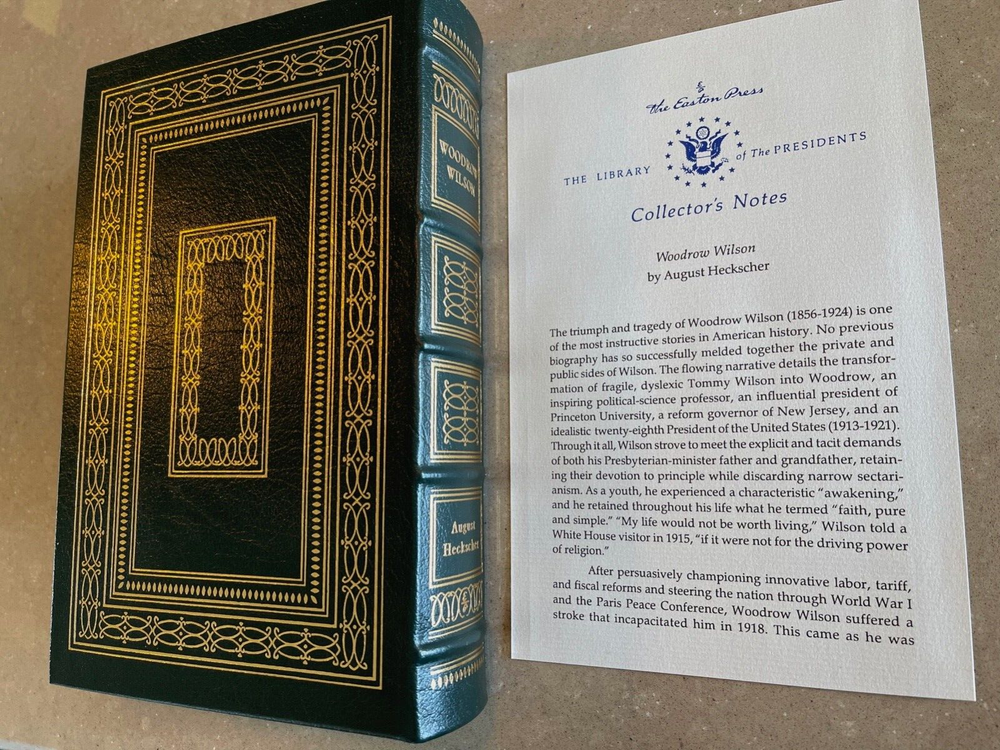 Easton Press: Woodrow Wilson, August Heckscher, with Collector's Notes This book is part of the Easton Press Presidential Library Collection. The book has never been read and is in pristine condition with no markings, name plates, highlights, tears or dog-eared pages. The leather cover is in mint condition. The gold gilding is bright, and the ribbon and binding are completely intact. I am the original owner; comes from a smoke-free home.