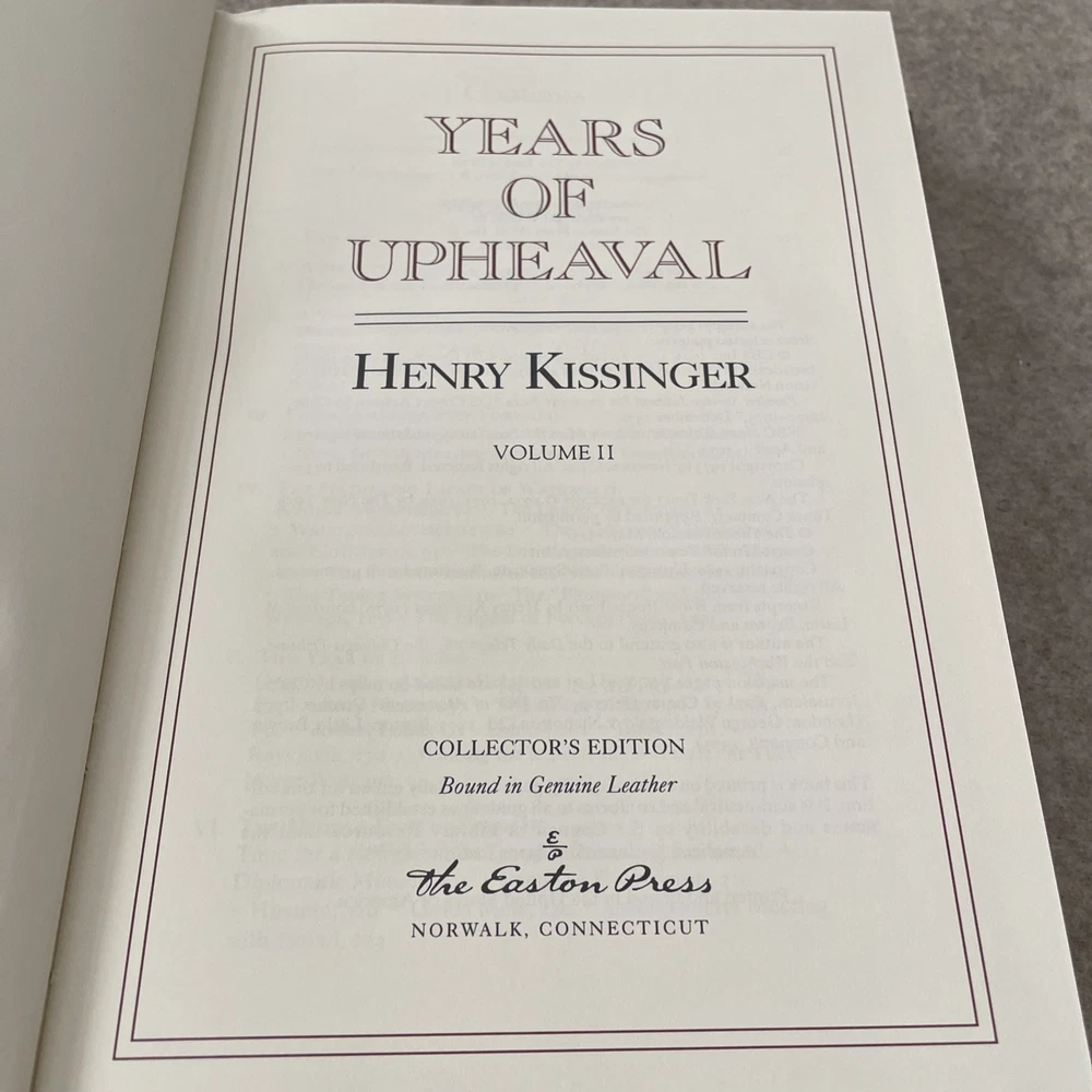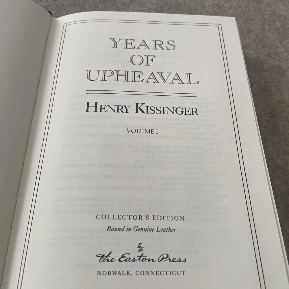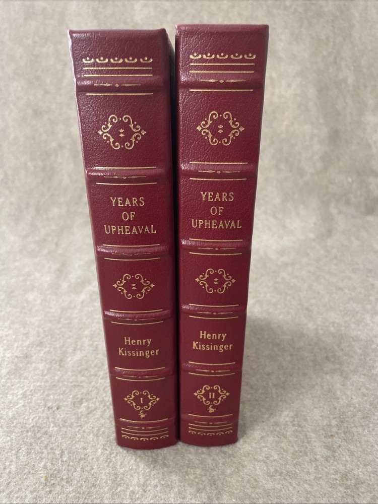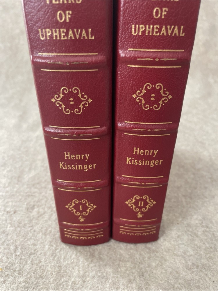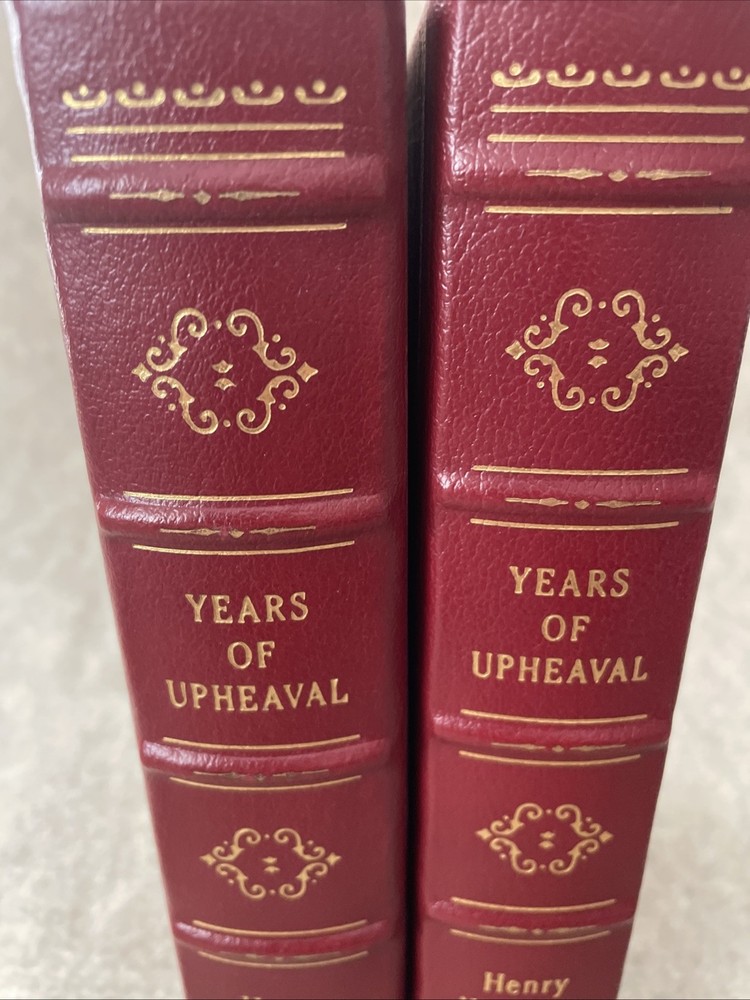 Easton Press Signed First Edition Years of Upheaval by Henry Kissinger in 2 volumes The books are full leather. This books are in near mint condition with a lightly bumped corner on each volume. There is residue in both volumes from a removed bookplate. The gold on the covers looks like new. The end pages show no fading. The gilt on the edge of the pages is in almost perfect condition with a scratch on each volume. Please see photos. We try to describe as accurately as possible so you will be satisfied with your purchase. We have more books from this set on eBay and we would be happy to combine on shipping to save you money. All books are sent with insurance via USPS Media Mail.
