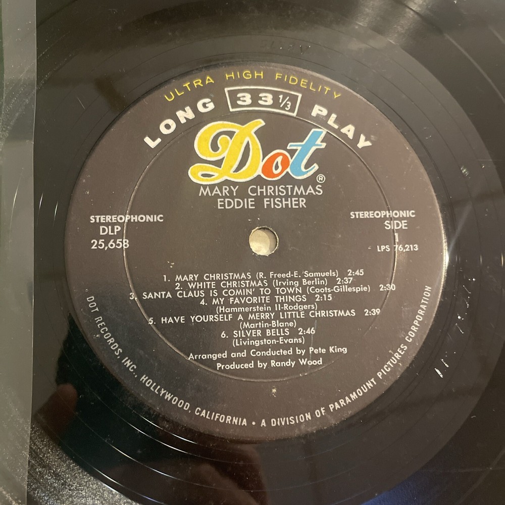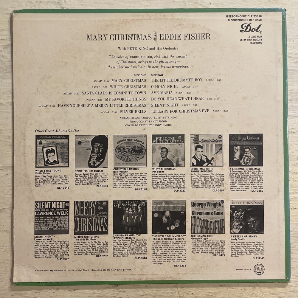 This Eddie Fisher Mary Christmas LP is a holiday gem for any vinyl record collector. The 12" record, released by Dot in the United States, features original cover art and is a first edition, first pressing. The speed of the record is 33RPM and the format is a classic LP. The cardboard sleeve and vinyl material give this LP a vintage feel, perfect for any Christmas occasion. The record grading is Good (G) and the sleeve grading is Very Good Plus (VG+). This LP is a great addition to any music collection and is sure to bring joy this holiday season.